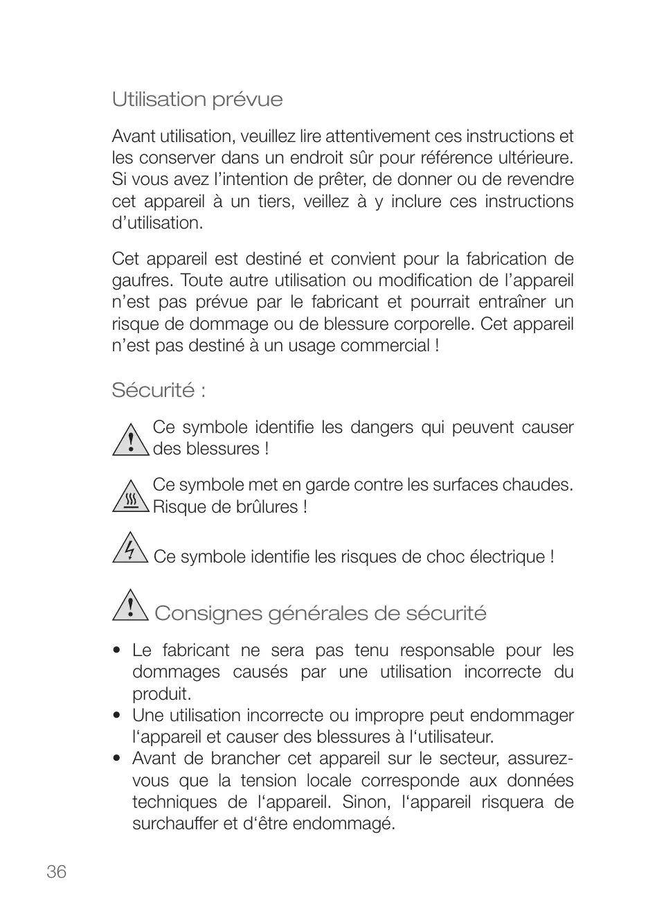 Utilisation prévue Avant utilisation, veuillez lire attentivement ces instructions et les conserver dans un endroit sûr pour référence ultérieure. Si vous avez l’intention de prêter, de donner ou de revendre cet appareil à un tiers, veillez à y inclure ces instructions d’utilisation. cet appareil est destiné et convient pour la fabrication de gaufres. toute autre utilisation ou modiication de l’appareil n’est pas prévue par le fabricant et pourrait entraîner un risque de dommage ou de blessure corporelle. cet appareil n’est pas destiné à un usage commercial ! Sécurité : ce symbole identiie les dangers qui peuvent causer des blessures ! ce symbole met en garde contre les surfaces chaudes. Risque de brûlures ! ce symbole identiie les risques de choc électrique ! Consignes générales de sécurité