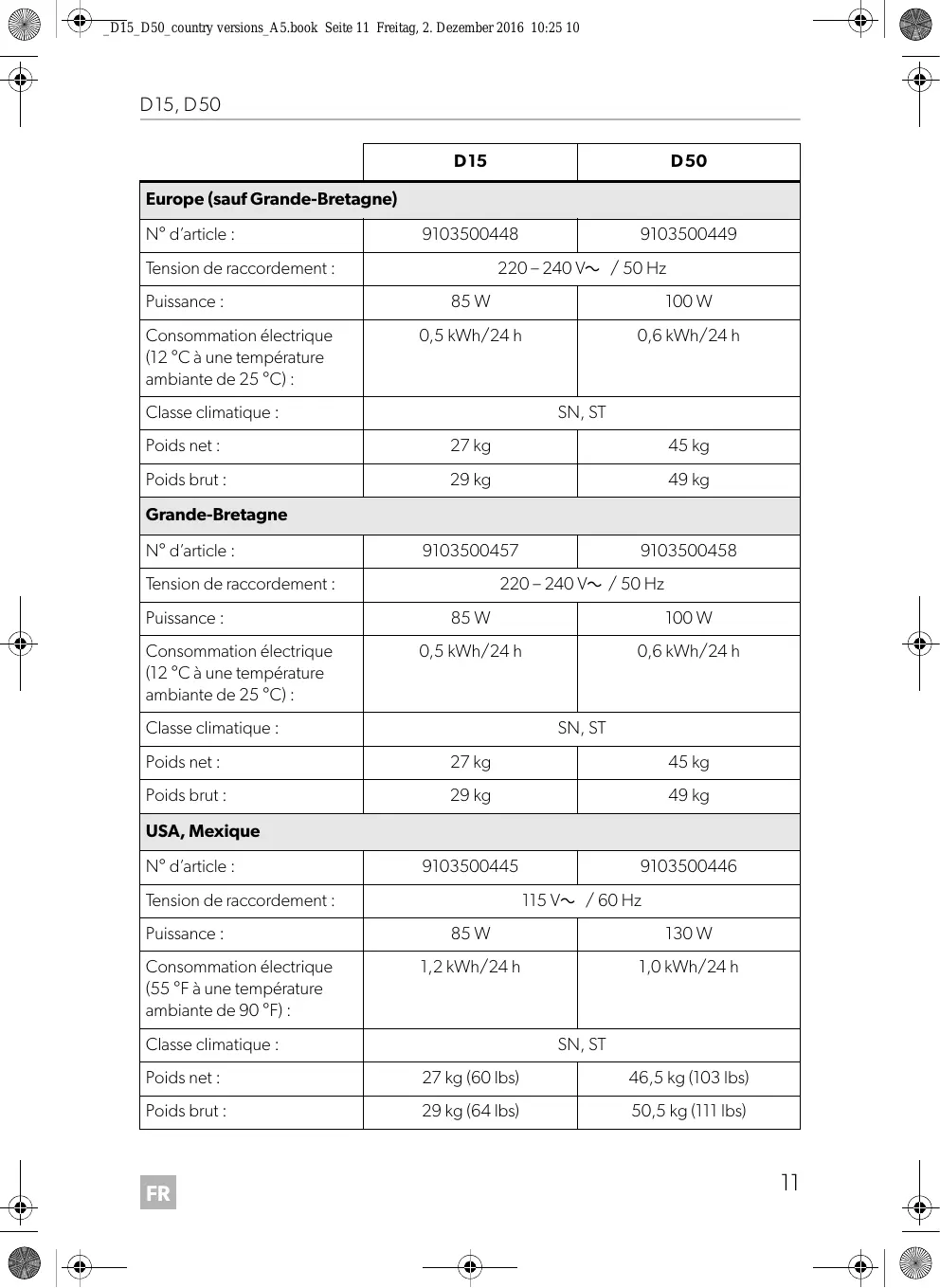 Europe (sauf Grande-Bretagne) N° d’article : Tension de raccordement : Puissance : Consommation électrique (12 °C à une température ambiante de 25 °C) : 220 – 240 Vw / 50 Hz 85 W 100 W 0,5 kWh/24 h 0,6 kWh/24 h Classe climatique : SN, ST Poids net : 27 kg 45 kg Poids brut : 29 kg 49 kg
