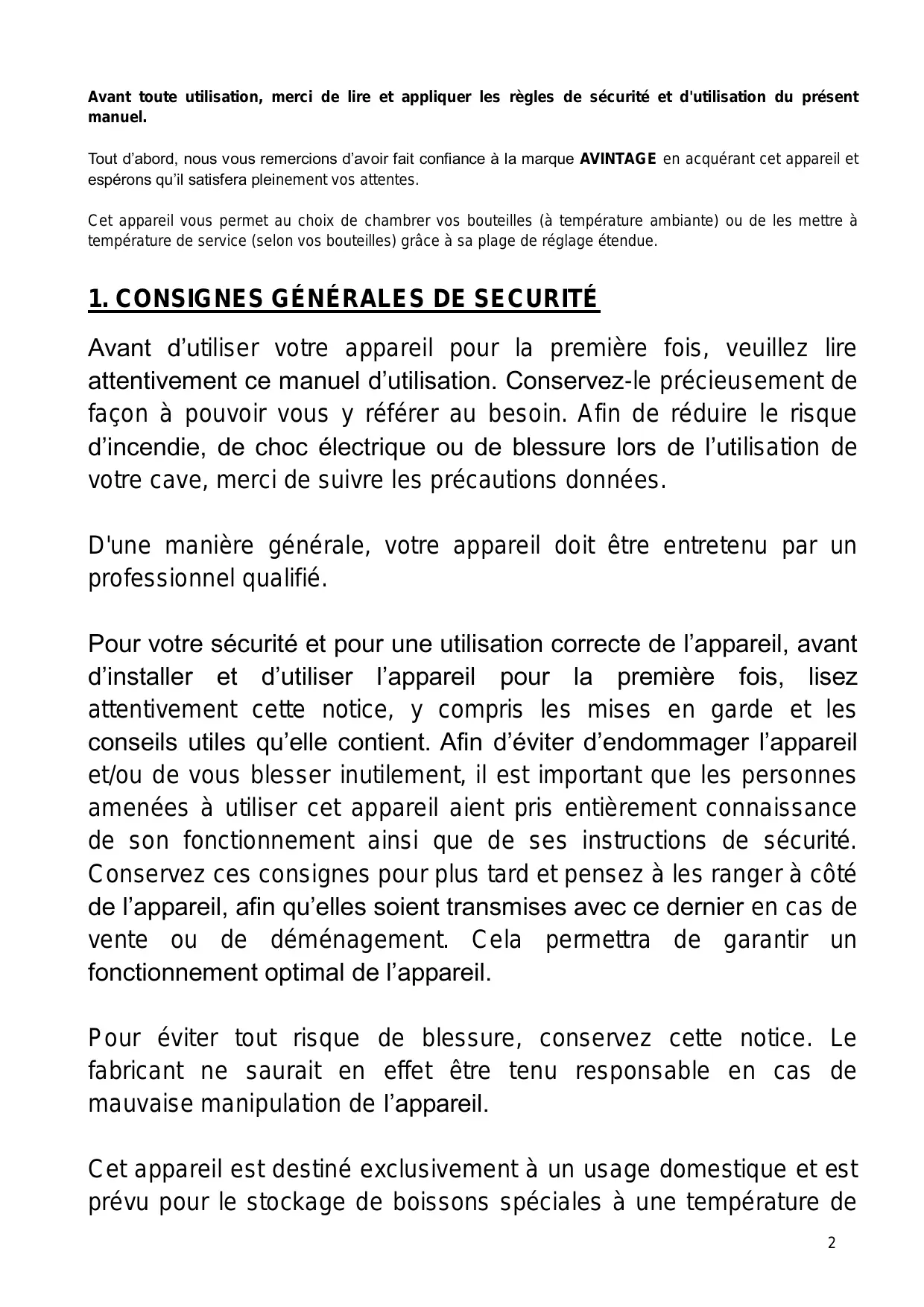 Avant d'utiliser votre apparéil pour la première fois, veuillez tire attentivement ce manuel d'utilisation. Conservez-le précieusement de façon à pouvoir vous y reférer au besoin. Afin de réduire le risque d'incendie, de chic électrique ou de blessure lors de l'utilisation de votre cave, merci de suivre les précautions données.