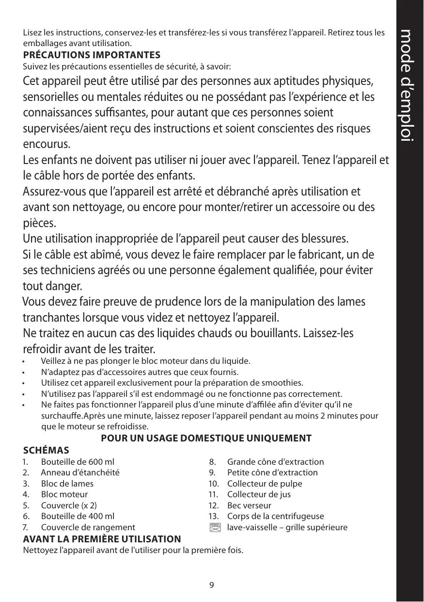 Suivez les précautions essentielles de sécurité, à savoir: Cet appareil peut être utilisé par des personnes aux aptitudes physiques, sensorielles ou mentales réduites ou ne possédant pas l’expérience et les connaissances suffisantes, pour autant que ces personnes soient supervisées/aient reçu des instructions et soient conscientes des risques encourus. Les enfants ne doivent pas utiliser ni jouer avec l’appareil. Tenez l’appareil et le câble hors de portée des enfants. Assurez-vous que l’appareil est arrêté et débranché après utilisation et avant son nettoyage, ou encore pour monter/retirer un accessoire ou des pièces. Une utilisation inappropriée de l’appareil peut causer des blessures. Si le câble est abîmé, vous devez le faire remplacer par le fabricant, un de ses techniciens agréés ou une personne également qualifiée, pour éviter tout danger. Vous devez faire preuve de prudence lors de la manipulation des lames tranchantes lorsque vous videz et nettoyez l’appareil. Ne traitez en aucun cas des liquides chauds ou bouillants. Laissez-les refroidir avant de les traiter.