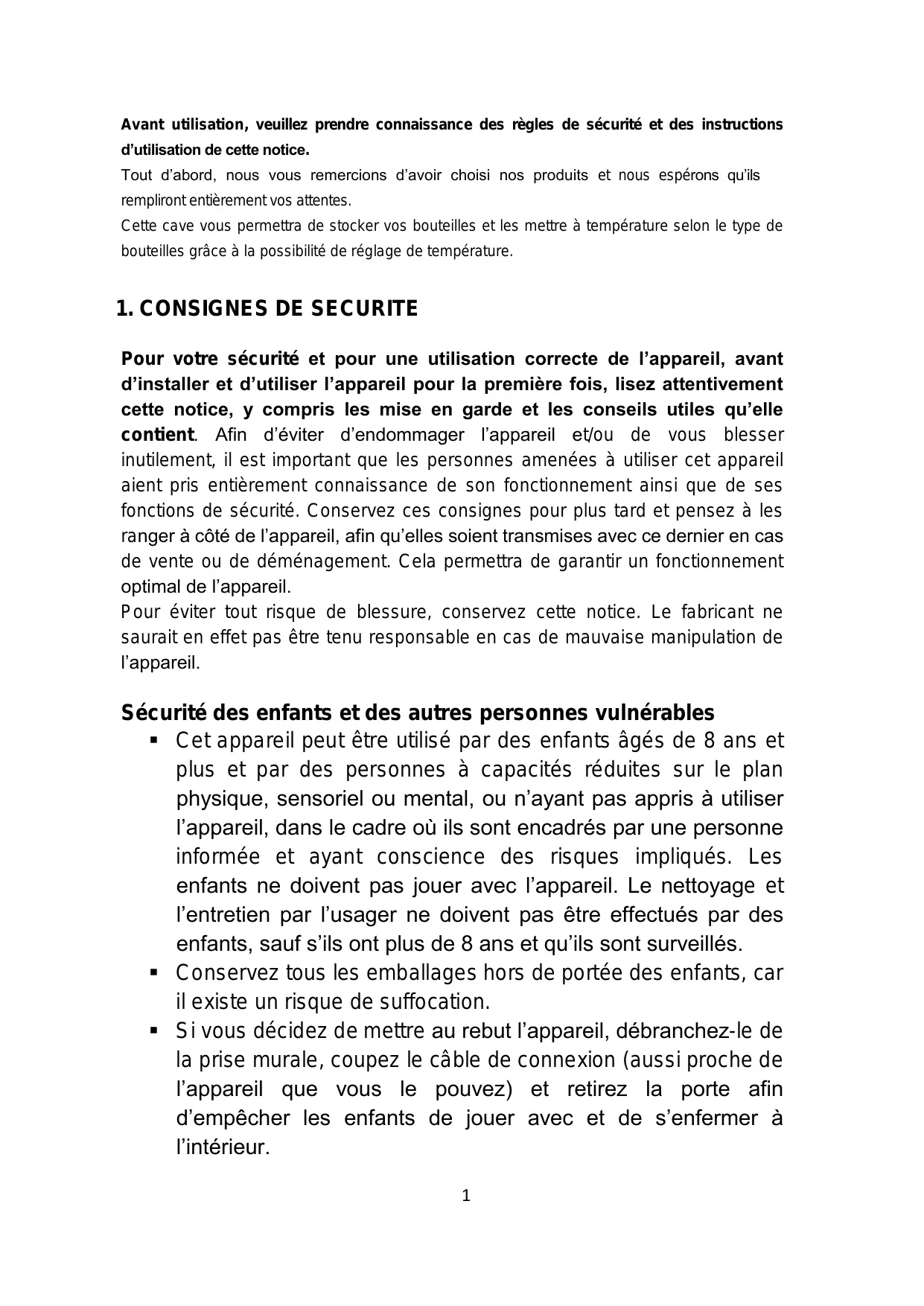 Avant utilisation, veuillez prendre connaissance des règles de sécurité et des instructions d’utilisation de cette notice. Tout d’abord, nous vous remercions d’avoir choisi nos produits et nous espérons qu’ils rempliront entièrement vos attentes. Cette cave vous permettra de stocker vos bouteilles et les mettre à température selon le type de bouteilles grâce à la possibilité de réglage de température.