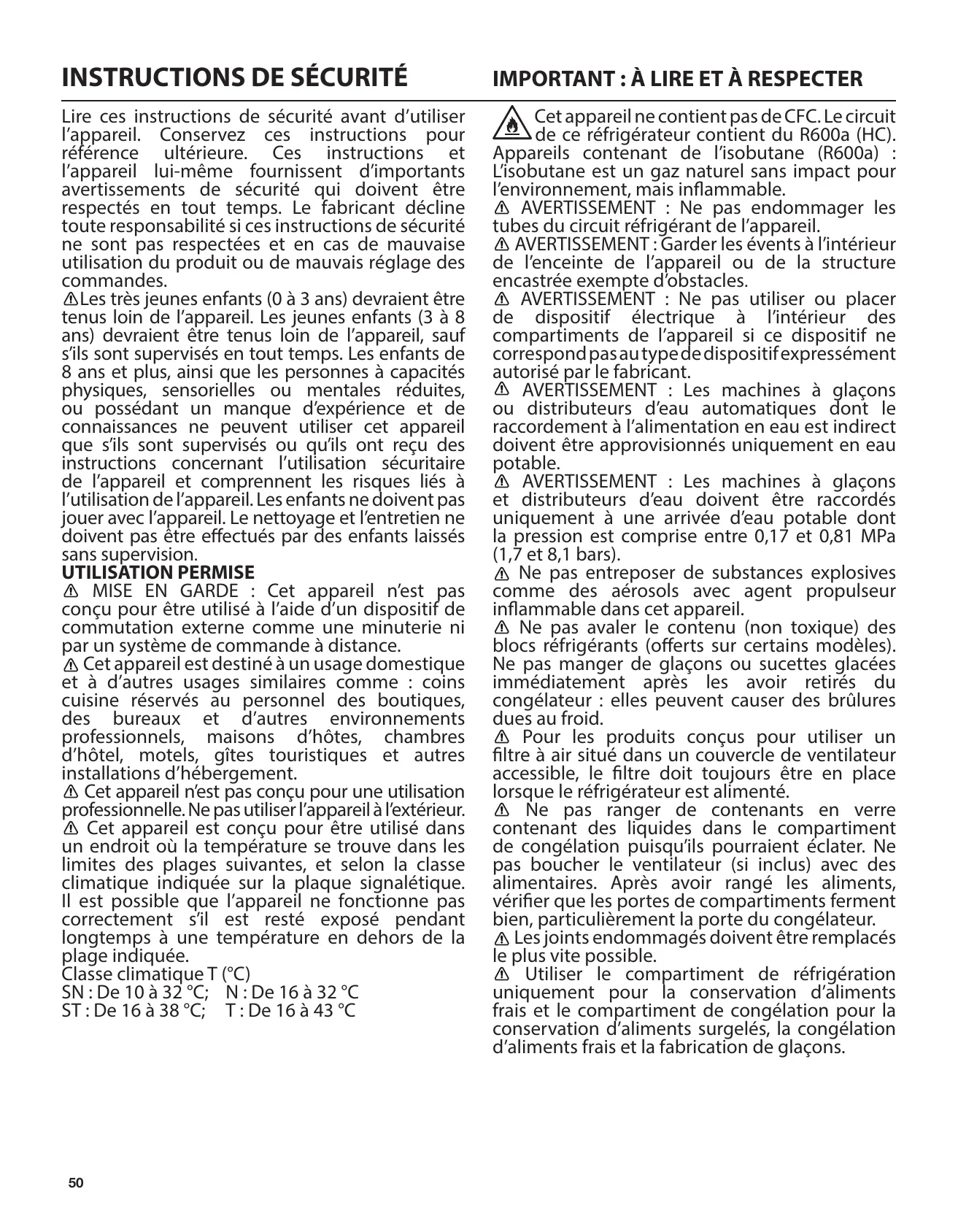 Appareils contenant de l’isobutane (R600a) : L’isobutane est un gaz naturel sans impact pour l’environnement, mais inflammable. AVERTISSEMENT : Ne pas endommager les tubes du circuit réfrigérant de l’appareil. AVERTISSEMENT : Garder les évents à l’intérieur de l’enceinte de l’appareil ou de la structure encastrée exempte d’obstacles. AVERTISSEMENT : Ne pas utiliser ou placer de dispositif électrique à l’intérieur des compartiments de l’appareil si ce dispositif ne correspond pas au type de dispositif expressément autorisé par le fabricant. AVERTISSEMENT : Les machines à glaçons ou distributeurs d’eau automatiques dont le raccordement à l’alimentation en eau est indirect doivent être approvisionnés uniquement en eau potable. AVERTISSEMENT : Les machines à glaçons et distributeurs d’eau doivent être raccordés uniquement à une arrivée d’eau potable dont la pression est comprise entre 0,17 et 0,81 MPa (1,7 et 8,1 bars). Ne pas entreposer de substances explosives comme des aérosols avec agent propulseur inflammable dans cet appareil. Ne pas avaler le contenu (non toxique) des blocs réfrigérants (offerts sur certains modèles). Ne pas manger de glaçons ou sucettes glacées immédiatement après les avoir retirés du congélateur : elles peuvent causer des brûlures dues au froid. Pour les produits conçus pour utiliser un filtre à air situé dans un couvercle de ventilateur accessible, le filtre doit toujours être en place lorsque le réfrigérateur est alimenté. Ne pas ranger de contenants en verre contenant des liquides dans le compartiment de congélation puisqu’ils pourraient éclater. Ne pas boucher le ventilateur (si inclus) avec des alimentaires. Après avoir rangé les aliments, vérifier que les portes de compartiments ferment bien, particulièrement la porte du congélateur. Les joints endommagés doivent être remplacés le plus vite possible. Utiliser le compartiment de réfrigération uniquement pour la conservation d’aliments frais et le compartiment de congélation pour la conservation d’aliments surgelés, la congélation d’aliments frais et la fabrication de glaçons.