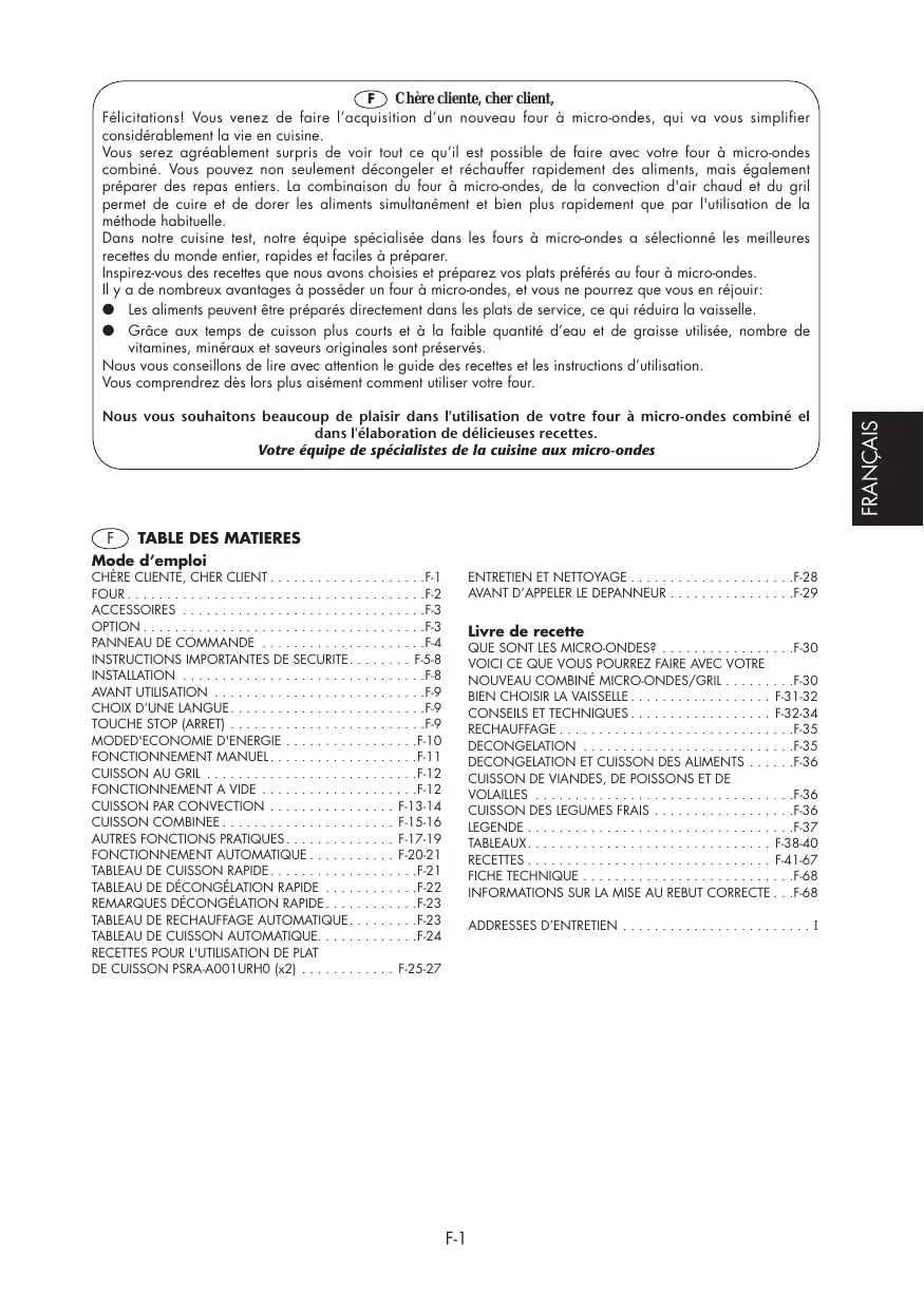 FRANÇAIS Nous vous souhaitons beaucoup de plaisir dans l'utilisation de votre four à micro-ondes combiné el dans l'élaboration de délicieuses recettes. Votre équipe de spécialistes de la cuisine aux micro-ondes DEUTSCH Chère cliente, cher client, Félicitations! Vous venez de faire l’acquisition d’un nouveau four à micro-ondes, qui va vous simplifier considérablement la vie en cuisine. Vous serez agréablement surpris de voir tout ce qu’il est possible de faire avec votre four à micro-ondes combiné. Vous pouvez non seulement décongeler et réchauffer rapidement des aliments, mais également préparer des repas entiers. La combinaison du four à micro-ondes, de la convection d'air chaud et du gril permet de cuire et de dorer les aliments simultanément et bien plus rapidement que par l'utilisation de la méthode habituelle. Dans notre cuisine test, notre équipe spécialisée dans les fours à micro-ondes a sélectionné les meilleures recettes du monde entier, rapides et faciles à préparer. Inspirez-vous des recettes que nous avons choisies et préparez vos plats préférés au four à micro-ondes. Il y a de nombreux avantages à posséder un four à micro-ondes, et vous ne pourrez que vous en réjouir: ● Les aliments peuvent être préparés directement dans les plats de service, ce qui réduira la vaisselle. ● Grâce aux temps de cuisson plus courts et à la faible quantité d’eau et de graisse utilisée, nombre de vitamines, minéraux et saveurs originales sont préservés. Nous vous conseillons de lire avec attention le guide des recettes et les instructions d’utilisation. Vous comprendrez dès lors plus aisément comment utiliser votre four. FOUR R-96ST-AA