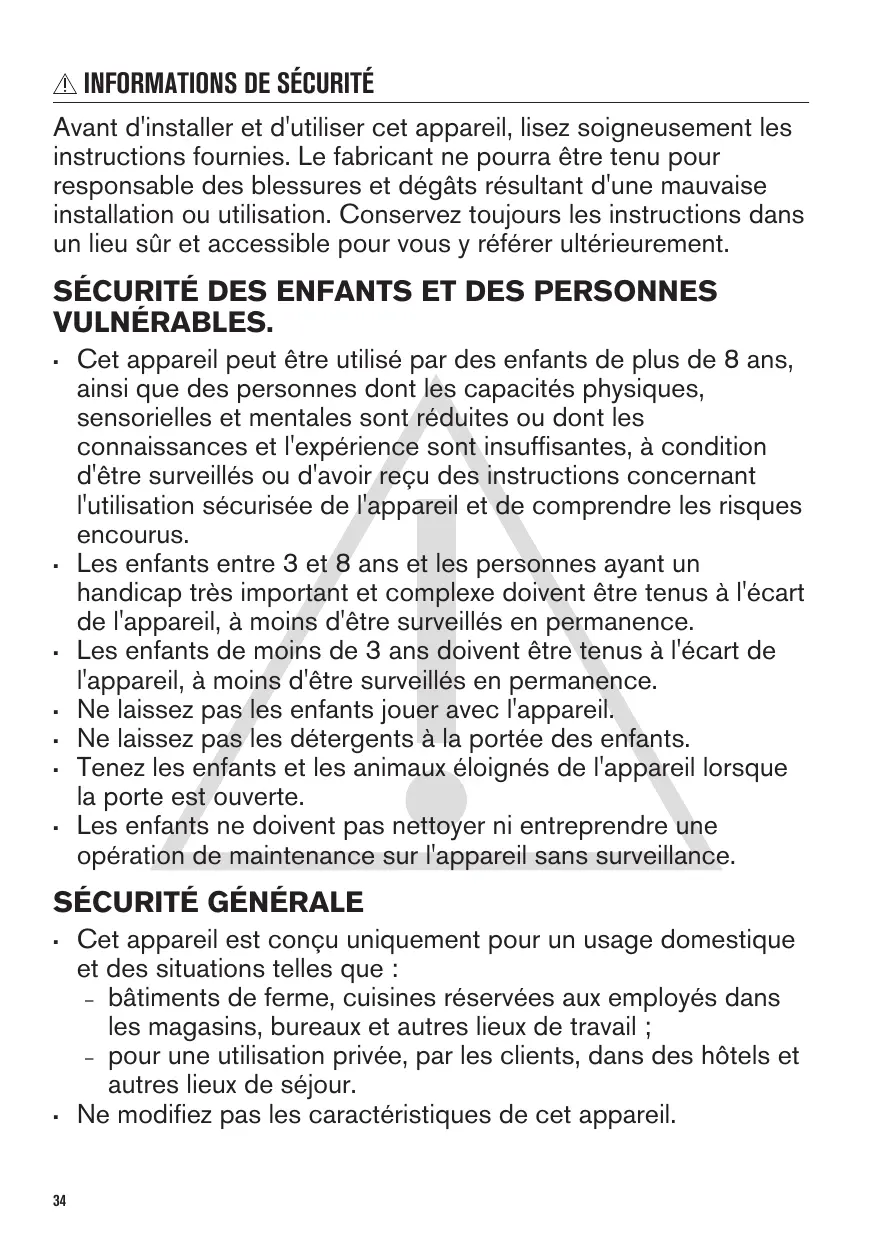 Cet appareil peut être utilisé par des enfants de plus de 8 ans, ainsi que des personnes dont les capacités physiques, sensorielles et mentales sont réduites ou dont les connaissances et l'expérience sont insuffisantes, à condition d'être surveillés ou d'avoir reçu des instructions concernant l'utilisation sécurisée de l'appareil et de comprendre les risques encourus. Les enfants entre 3 et 8 ans et les personnes ayant un handicap très important et complexe doivent être tenus à l'écart de l'appareil, à moins d'être surveillés en permanence. Les enfants de moins de 3 ans doivent être tenus à l'écart de l'appareil, à moins d'être surveillés en permanence. Ne laissez pas les enfants jouer avec l'appareil. Ne laissez pas les détergents à la portée des enfants. Tenez les enfants et les animaux éloignés de l'appareil lorsque la porte est ouverte. Les enfants ne doivent pas nettoyer ni entreprendre une opération de maintenance sur l'appareil sans surveillance.
