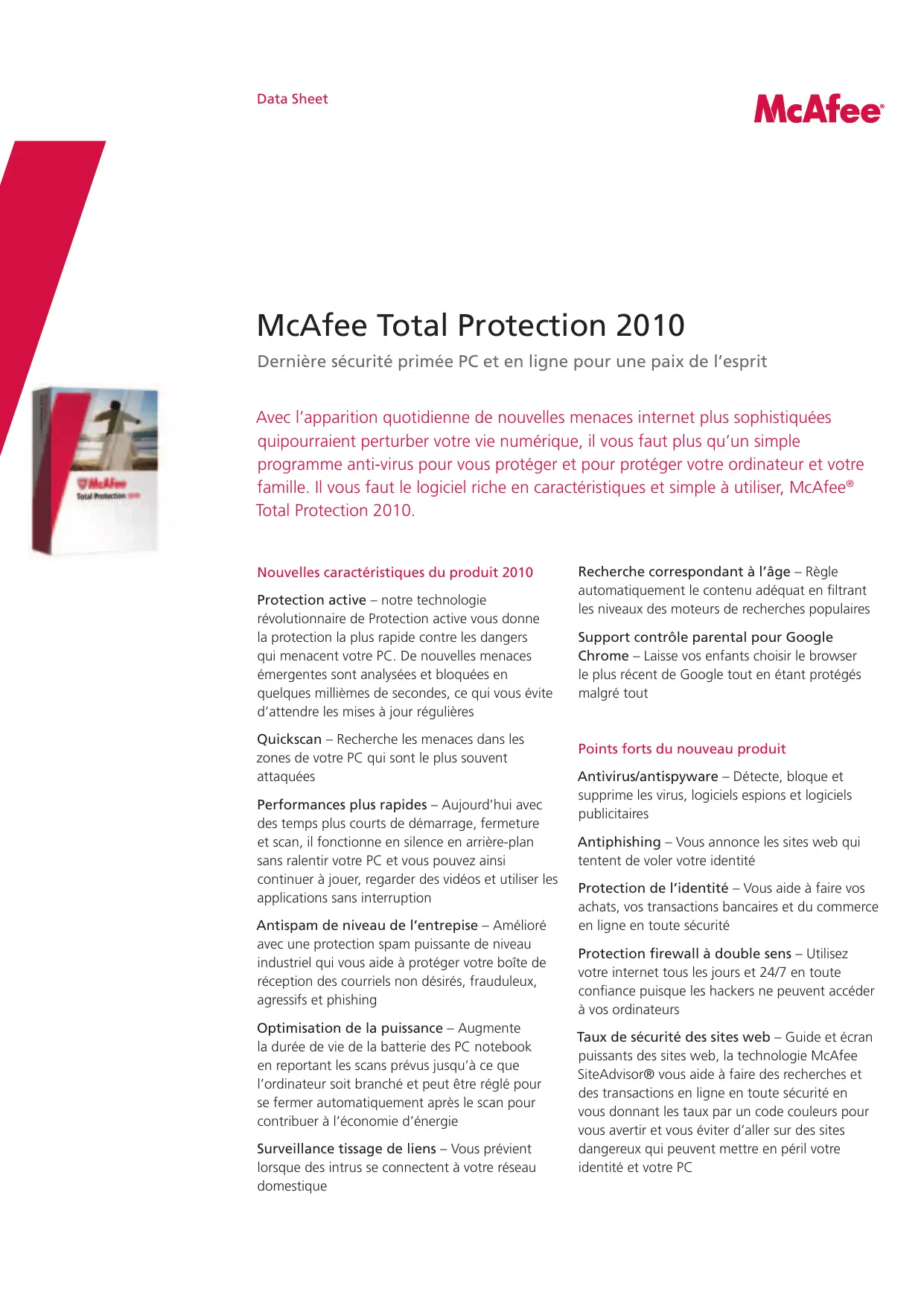 Avec l' apparition quotidienne de nouvelles menaces internet plus sophistiquées quipourraient perturber votre vie numérique, il vous faut plus qu'un simple programme anti-virus pour vous protégé et pour protégé votre ordinateur et votre famille. Il vous faut le logiciel riche en caractéristiques et simple à utiliser, McAfee® Total Protection 2010.