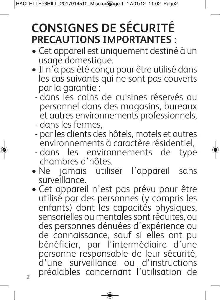 CONSIGNES DE SÉCURITÉ PRECAUTIONS IMPORTANTES : • Cet appareil est uniquement destiné à un usage domestique. • Il n’a pas été conçu pour être utilisé dans les cas suivants qui ne sont pas couverts par la garantie : - dans les coins de cuisines réservés au personnel dans des magasins, bureaux et autres environnements professionnels, - dans les fermes, - par les clients des hôtels, motels et autres environnements à caractère résidentiel, - dans les environnements de type chambres d’hôtes. • Ne jamais utiliser l’appareil sans surveillance. • Cet appareil n’est pas prévu pour être utilisé par des personnes (y compris les enfants) dont les capacités physiques, sensorielles ou mentales sont réduites, ou des personnes dénuées d’expérience ou de connaissance, sauf si elles ont pu bénéficier, par l’intermédiaire d’une personne responsable de leur sécurité, d’une surveillance ou d’instructions préalables concernant l’utilisation de 2