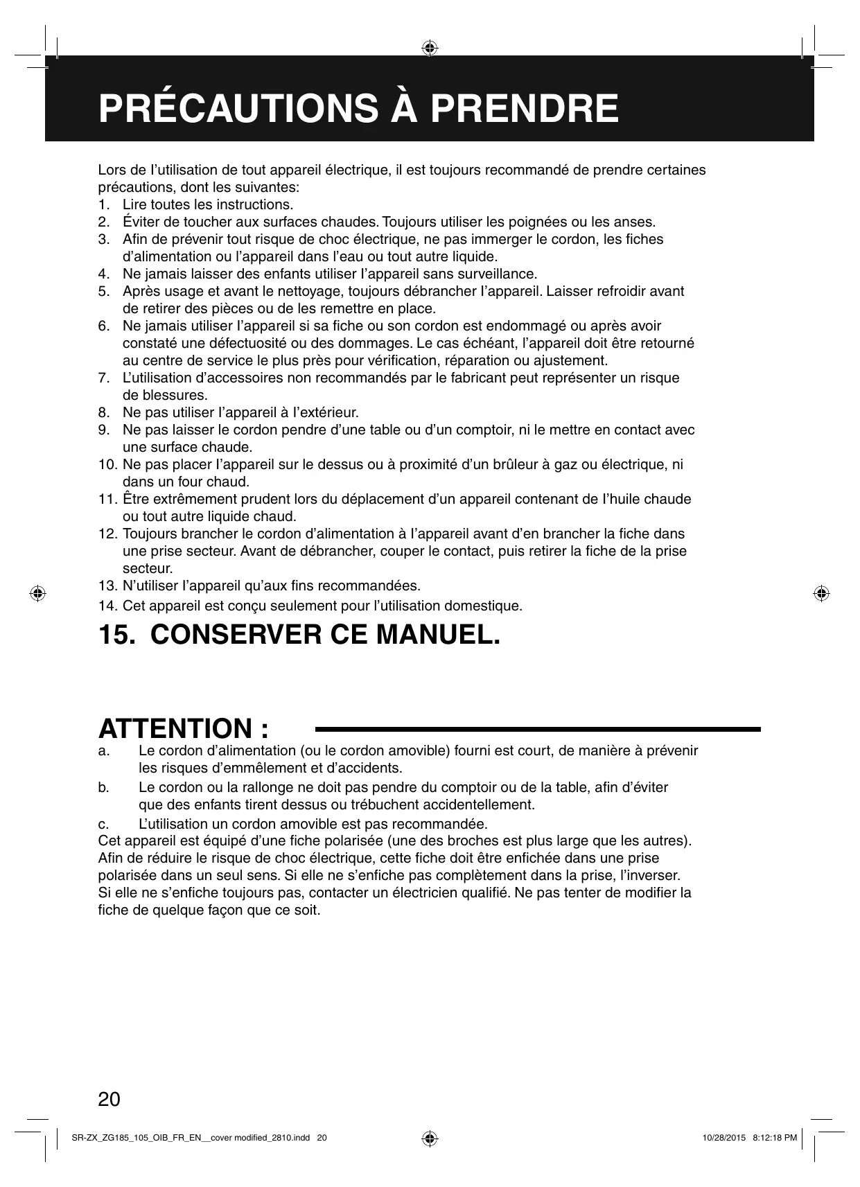 1. Lire toutes les instructions. 2. Éviter de toucher aux surfaces chaudes. Toujours utiliser les poignées ou les anses. 3. Afin de prévenir tout risque de choc électrique, ne pas immerger le cordon, les fiches d’alimentation ou l’appareil dans l’eau ou tout autre liquide. 4. Ne jamais laisser des enfants utiliser I’appareil sans surveillance. 5. Après usage et avant le nettoyage, toujours débrancher I’appareil. Laisser refroidir avant de retirer des pièces ou de les remettre en place. 6. Ne jamais utiliser I’appareil si sa fiche ou son cordon est endommagé ou après avoir constaté une défectuosité ou des dommages. Le cas échéant, l’appareil doit être retourné au centre de service le plus près pour vérification, réparation ou ajustement. 7. L’utilisation d’accessoires non recommandés par le fabricant peut représenter un risque de blessures. 8. Ne pas utiliser I’appareil à I’extérieur. 9. Ne pas laisser le cordon pendre d’une table ou d’un comptoir, ni le mettre en contact avec une surface chaude. 10. Ne pas placer I’appareil sur le dessus ou à proximité d’un brûleur à gaz ou électrique, ni dans un four chaud. 11. Être extrêmement prudent lors du déplacement d’un appareil contenant de I’huile chaude ou tout autre liquide chaud. 12. Toujours brancher le cordon d’alimentation à I’appareil avant d’en brancher la fiche dans une prise secteur. Avant de débrancher, couper le contact, puis retirer la fiche de la prise secteur. 13. N’utiliser I’appareil qu’aux fins recommandées. 14. Cet appareil est conçu seulement pour l’utilisation domestique.