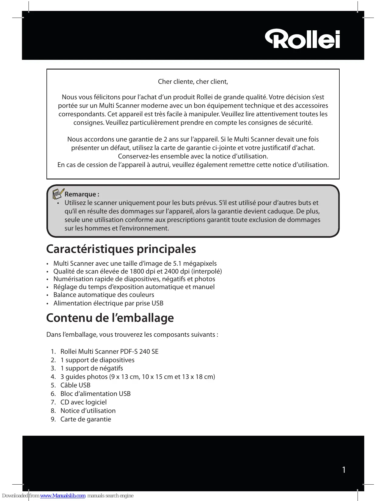 Cher cliente, cher client, Nous vous félicitons pour l’achat d’un produit Rollei de grande qualité. Votre décision s’est portée sur un Multi Scanner moderne avec un bon équipement technique et des accessoires correspondants. Cet appareil est très facile à manipuler. Veuillez lire attentivement toutes les consignes. Veuillez particulièrement prendre en compte les consignes de sécurité. Nous accordons une garantie de 2 ans sur l’appareil. Si le Multi Scanner devait une fois présenter un défaut, utilisez la carte de garantie ci-jointe et votre justificatif d’achat. Conservez-les ensemble avec la notice d’utilisation. En cas de cession de l’appareil à autrui, veuillez également remettre cette notice d’utilisation.