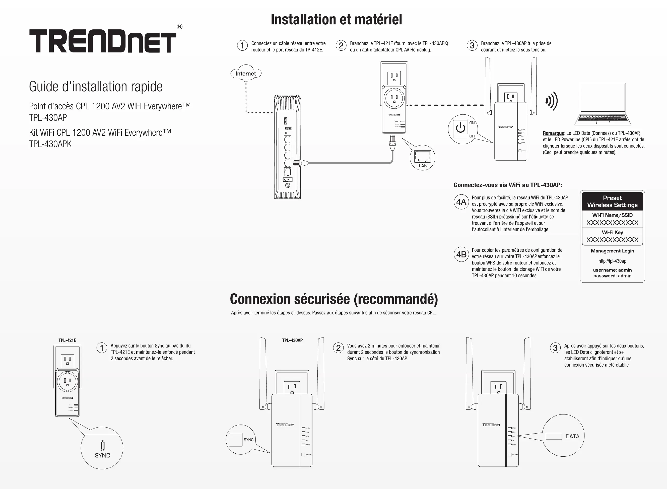Téléchargez la notice de votre Point d'accès au format PDF gratuitement ! Retrouvez votre notice TPL-403AP - TRENDNET et reprennez votre appareil électronique en main. Sur cette page sont publiés tous les documents nécessaires à l'utilisation de votre appareil TPL-403AP de la marque TRENDNET.
