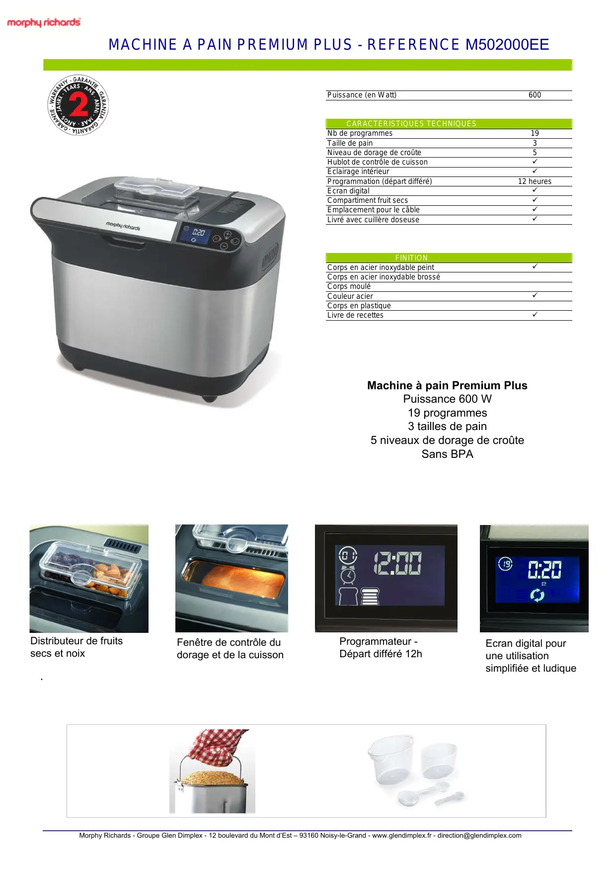 Machine à pain Premium Plus Puissance 600 W 19 programmes 3 tailles de pain 5 niveaux de dorage de croûte Sans BPA Distributeur de fruits secs et noix Fenêtre de contrôle du dorage et de la cuisson Programmateur Départ différé 12h Ecran digital pour une utilisation simplifiée et ludique Morphy Richards - Groupe Glen Dimplex - 12 boulevard du Mont d’Est – 93160 Noisy-le-Grand - www.glendimplex.fr - direction@glendimplex.com