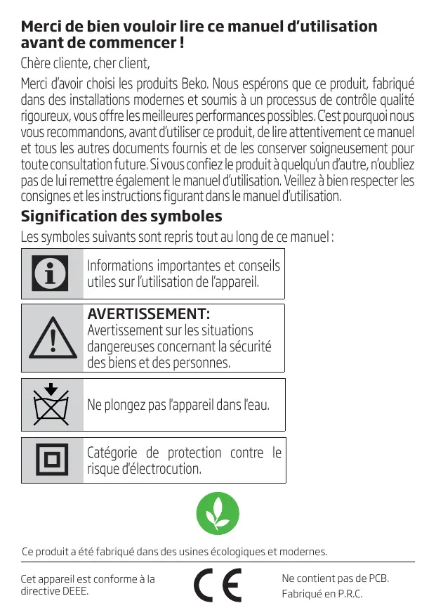 Merci de bien vouloir lire ce manuel d'utilisation avant de commencer ! Chère cliente, cher client, Merci d’avoir choisi les produits Beko. Nous espérons que ce produit, fabriqué dans des installations modernes et soumis à un processus de contrôle qualité rigoureux, vous offre les meilleures performances possibles. C’est pourquoi nous vous recommandons, avant d’utiliser ce produit, de lire attentivement ce manuel et tous les autres documents fournis et de les conserver soigneusement pour toute consultation future. Si vous confiez le produit à quelqu’un d’autre, n’oubliez pas de lui remettre également le manuel d’utilisation. Veillez à bien respecter les consignes et les instructions figurant dans le manuel d’utilisation. Signification des symboles Les symboles suivants sont repris tout au long de ce manuel :