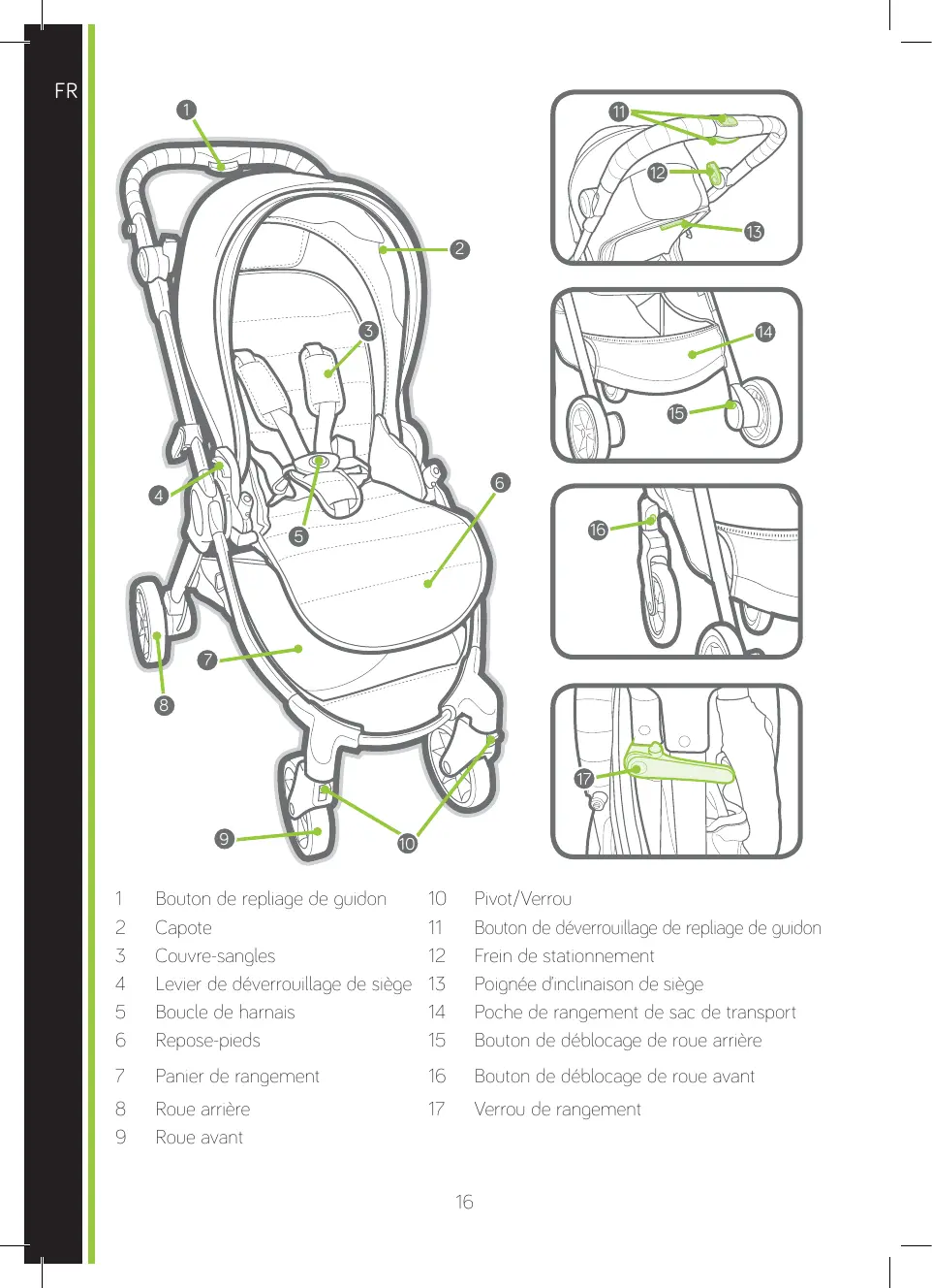 9 Installation •A lignez l’essieu de roue arrière sur la monture de roue sur le cadre de la poussette et insérez-le dans la monture de roue jusqu’à ce qu’il se verrouille en place. Un déclic retentira. • T irez délicatement sur la roue arrière pour vous assurer qu’elle est correctement attachée. 10 Dépose •T out en appuyant sur le bouton de déblocage de la roue, faites délicatement glisser la roue arrière hors de la monture de roue. FREIN 11 Pour verrouiller les freins : Faites pivoter le levier de frein vers le bas pour enclencher les freins. 12 Pour déverrouiller les freins : Appuyez sur le bouton de déverrouillage du frein. AVERTISSEMENT : Assurez-vous que le frein est correctement enclenché en déplaçant la poussette légèrement en avant et en arrière. Verrouillez les freins avant de mettre l’enfant dans ou de le sortir de la poussette, et lorsque la poussette ne bouge pas. FIXATION DE LA CAPOTE 13 Insérez les extrémités de la capote dans le cadre du siège. 14 Nouez la petite sangle au crochet sur les côtés du siège. 15 Depuis l’arrière du siège, fermez la fermeture-éclair de la capote sur le siège. FIXATION DU SIÈGE 16 Pour attacher le cadre du siège au cadre de la poussette : Dépliez le siège et abaissez le siège sur les supports de fixation du cadre de la poussette. Vous entendrez un déclic lorsqu’il est bien attaché. • Le siège peut également être attaché dirigé vers l’arrière. 17 Pour retirer le siège : relevez les leviers de déverrouillage du siège. CAPOTE 18 Poussez vers l’avant pour ouvrir la capote, poussez vers l’arrière pour la fermer.