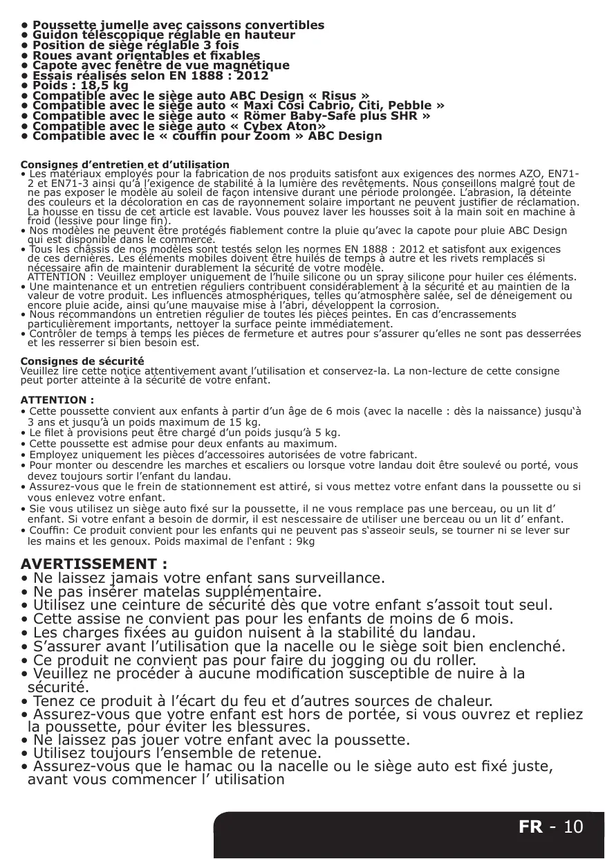 Poussette jumelle avec caissons convertibles Guidon télescopique réglable en hauteur Position de siège réglable 3 fois Roues avant orientables et fixables Capote avec fenêtre de vue magnétique Essais réalisés selon EN 1888 : 2012 Poids : 18,5 kg Compatible avec le siège auto ABC Design « Risus » Compatible avec le siège auto « Maxi Cosi Cabrio, Citi, Pebble » Compatible avec le siège auto « Römer Baby-Safe plus SHR » Compatible avec le siège auto « Cybex Aton» Compatible avec le « couffin pour Zoom » ABC Design Consignes d’entretien et d’utilisation