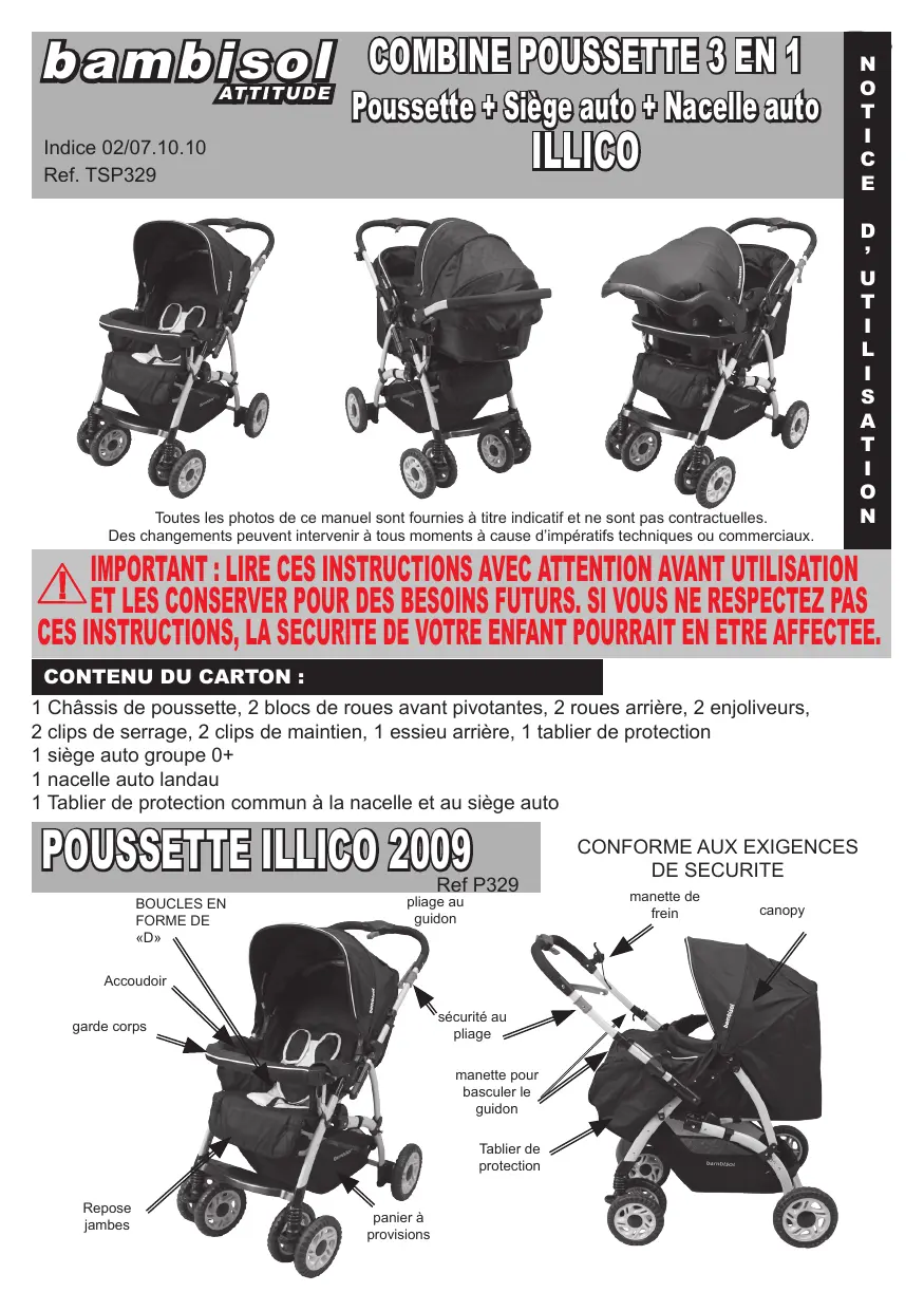 bambisol COMBINE POUSSETTE 3 EN 1 ATTITUDE P.1 Poussette + Siège auto + Nacelle auto ILLICO Indice 02/07.10.10 Ref. TSP329 Toutes les photos de ce manuel sont fournies à titre indicatif et ne sont pas contractuelles. Des changements peuvent intervenir à tous moments à cause d’impératifs techniques ou commerciaux.