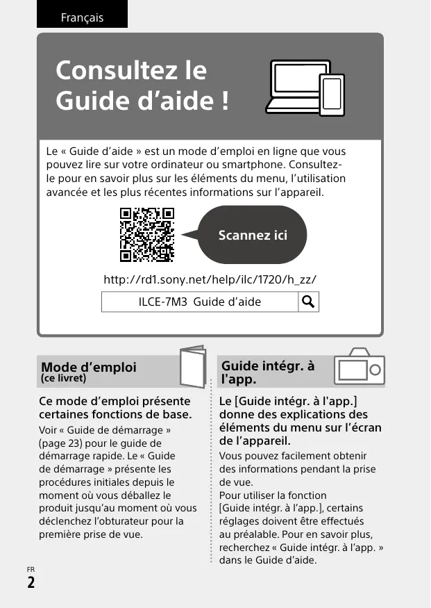 Consultez le « Guide d’aide » pour obtenir des instructions détaillées au sujet des nombreuses fonctions de l’appareil. http://rd1.sony.net/help/ilc/1720/h_zz/