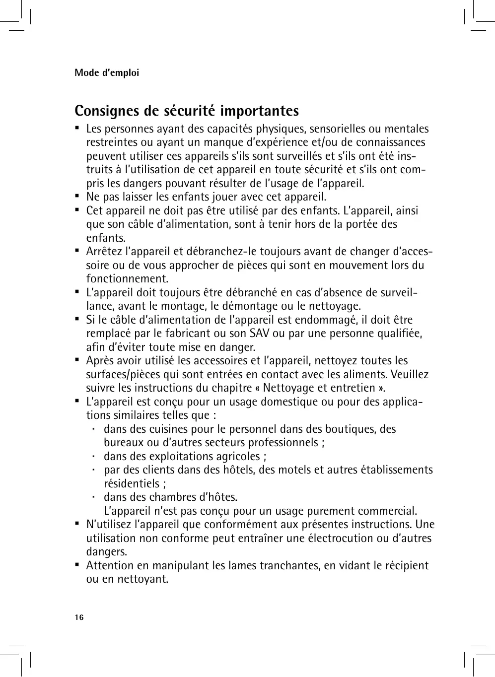 ▪▪ Les personnes ayant des capacités physiques, sensorielles ou mentales restreintes ou ayant un manque d’expérience et/ou de connaissances peuvent utiliser ces appareils s’ils sont surveillés et s’ils ont été instruits à l’utilisation de cet appareil en toute sécurité et s’ils ont compris les dangers pouvant résulter de l’usage de l’appareil. ▪▪ Ne pas laisser les enfants jouer avec cet appareil. ▪▪ Cet appareil ne doit pas être utilisé par des enfants. L’appareil, ainsi que son câble d’alimentation, sont à tenir hors de la portée des enfants. ▪▪ Arrêtez l’appareil et débranchez-le toujours avant de changer d’accessoire ou de vous approcher de pièces qui sont en mouvement lors du fonctionnement. ▪▪ L’appareil doit toujours être débranché en cas d’absence de surveillance, avant le montage, le démontage ou le nettoyage. ▪▪ Si le câble d’alimentation de l’appareil est endommagé, il doit être remplacé par le fabricant ou son SAV ou par une personne qualifiée, afin d’éviter toute mise en danger. ▪▪ Après avoir utilisé les accessoires et l’appareil, nettoyez toutes les surfaces/pièces qui sont entrées en contact avec les aliments. Veuillez suivre les instructions du chapitre « Nettoyage et entretien ». ▪▪ L’appareil est conçu pour un usage domestique ou pour des applications similaires telles que : ⋅⋅ dans des cuisines pour le personnel dans des boutiques, des bureaux ou d’autres secteurs professionnels ; ⋅⋅ dans des exploitations agricoles ; ⋅⋅ par des clients dans des hôtels, des motels et autres établissements résidentiels ; ⋅⋅ dans des chambres d’hôtes. L’appareil n’est pas conçu pour un usage purement commercial. ▪▪ N’utilisez l’appareil que conformément aux présentes instructions. Une utilisation non conforme peut entraîner une électrocution ou d’autres dangers. ▪▪ Attention en manipulant les lames tranchantes, en vidant le récipient ou en nettoyant. 16