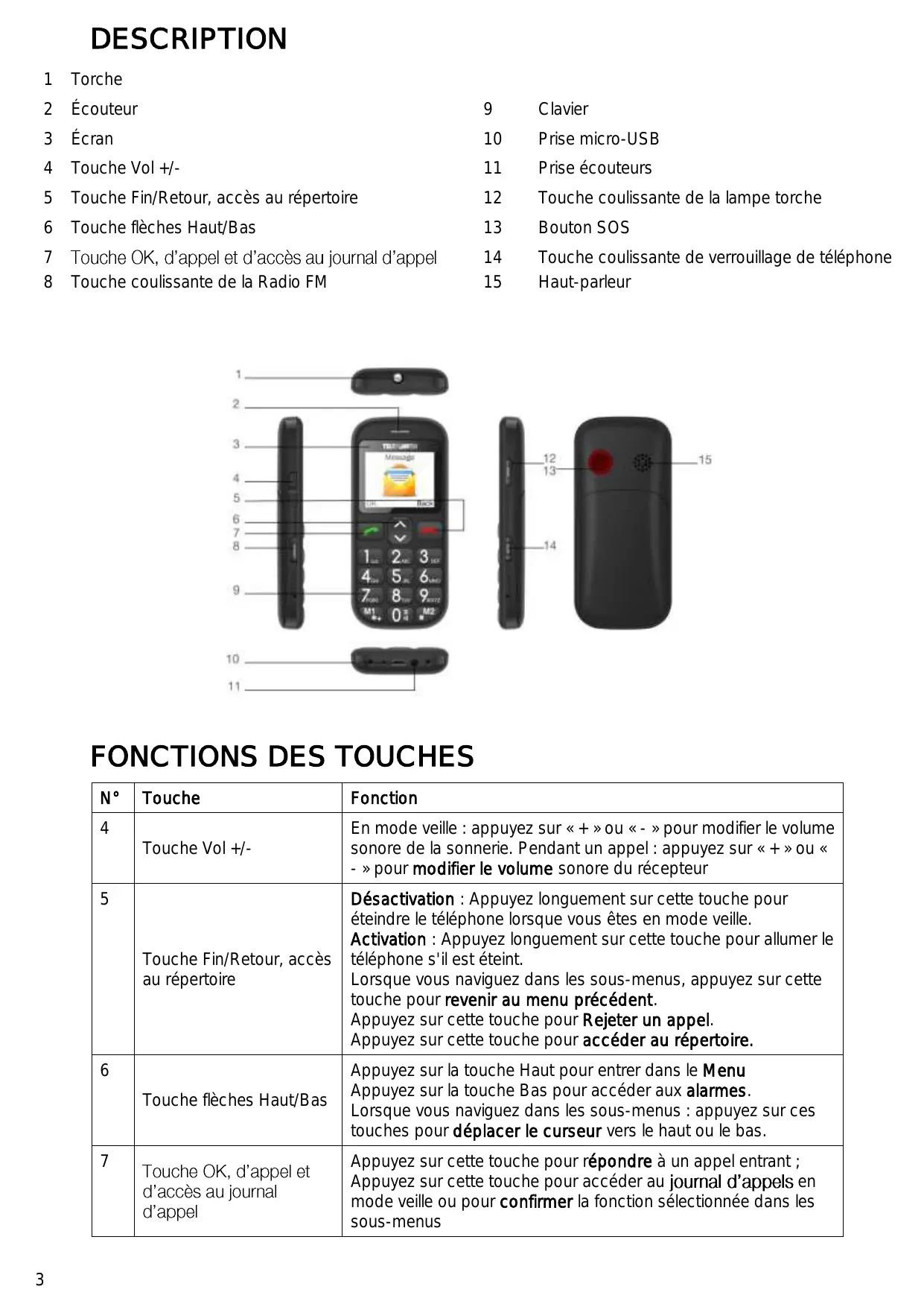| 7 | Touche OK, d'appe et d'accès au journal d'appe | Appuyez sur cette touche pour répondre à un appel entrant ; Appuyez sur cette touche pour accéder au journal d'appels en mode veille ou pour confirmer la fonction sélectionnée dans les sous-menus |