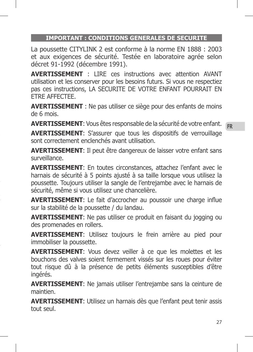 La poussette CITYLINK 2 est conforme à la norme EN 1888 : 2003 et aux exigences de sécurité. Testée en laboratoire agrée selon décret 91-1992 (décembre 1991). AVERTISSEMENT : LIRE ces instructions avec attention AVANT utilisation et les conserver pour les besoins futurs. Si vous ne respectiez pas ces instructions, LA SECURITE DE VOTRE ENFANT POURRAIT EN ETRE AFFECTEE. AVERTISSEMENT : Ne pas utiliser ce siège pour des enfants de moins de 6 mois. AVERTISSEMENT: Vous êtes responsable de la sécurité de votre enfant. FR AVERTISSEMENT: S’assurer que tous les dispositifs de verrouillage sont correctement enclenchés avant utilisation. AVERTISSEMENT: Il peut être dangereux de laisser votre enfant sans surveillance. AVERTISSEMENT: En toutes circonstances, attachez l’enfant avec le harnais de sécurité à 5 points ajusté à sa taille lorsque vous utilisez la poussette. Toujours utiliser la sangle de l’entrejambe avec le harnais de sécurité, même si vous utilisez une chancelière. AVERTISSEMENT: Le fait d’accrocher au poussoir une charge influe sur la stabilité de la poussette / du landau. AVERTISSEMENT: Ne pas utiliser ce produit en faisant du jogging ou des promenades en rollers. AVERTISSEMENT: Utilisez toujours le frein arrière au pied pour immobiliser la poussette. AVERTISSEMENT: Vous devez veiller à ce que les molettes et les bouchons des valves soient fermement vissés sur les roues pour éviter tout risque dû à la présence de petits éléments susceptibles d’être ingérés. AVERTISSEMENT: Ne jamais utiliser l’entrejambe sans la ceinture de maintien. AVERTISSEMENT: Utilisez un harnais dès que l’enfant peut tenir assis tout seul. 27