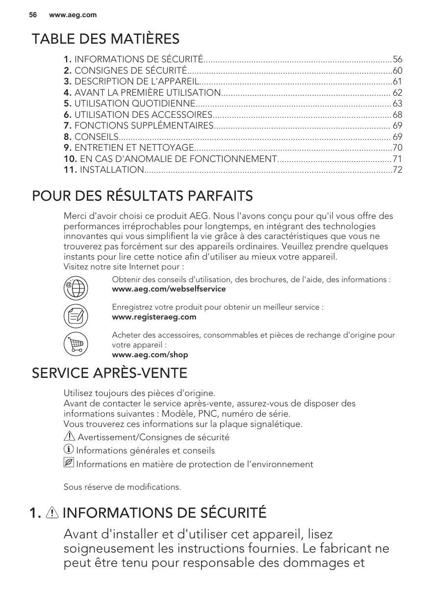 Merci d'avoir choisi ce produit AEG. Nous l'avons conçu pour qu'il vous offre des performances irréprochables pour longtemps, en intégrant des technologies innovantes qui vous simplifient la vie grâce à des caractéristiques que vous ne trouverez pas forcément sur des appareils ordinaires. Veuillez prendre quelques instants pour lire cette notice afin d'utiliser au mieux votre appareil. Visitez notre site Internet pour : Obtenir des conseils d'utilisation, des brochures, de l'aide, des informations : www.aeg.com/webselfservice Enregistrez votre produit pour obtenir un meilleur service : www.registeraeg.com Acheter des accessoires, consommables et pièces de rechange d'origine pour votre appareil : www.aeg.com/shop