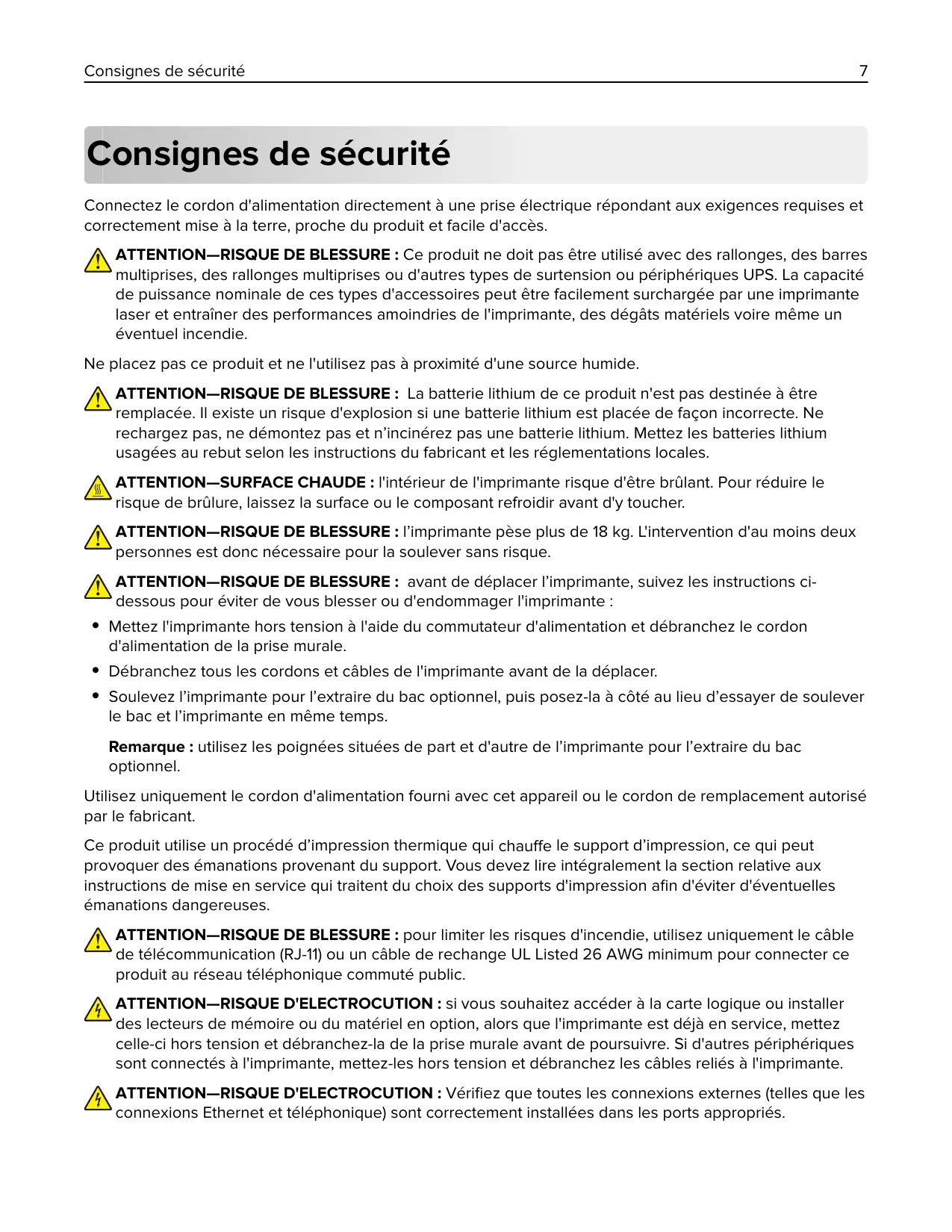 Consignes de sécurité Connectez le cordon d'alimentation directement à une prise électrique répondant aux exigences requises et correctement mise à la terre, proche du produit et facile d'accès. ATTENTION—RISQUE DE BLESSURE : Ce produit ne doit pas être utilisé avec des rallonges, des barres multiprises, des rallonges multiprises ou d'autres types de surtension ou périphériques UPS. La capacité de puissance nominale de ces types d'accessoires peut être facilement surchargée par une imprimante laser et entraîner des performances amoindries de l'imprimante, des dégâts matériels voire même un éventuel incendie. Ne placez pas ce produit et ne l'utilisez pas à proximité d'une source humide. ATTENTION—RISQUE DE BLESSURE : La batterie lithium de ce produit n'est pas destinée à être remplacée. Il existe un risque d'explosion si une batterie lithium est placée de façon incorrecte. Ne rechargez pas, ne démontez pas et n’incinérez pas une batterie lithium. Mettez les batteries lithium usagées au rebut selon les instructions du fabricant et les réglementations locales. ATTENTION—SURFACE CHAUDE : l'intérieur de l'imprimante risque d'être brûlant. Pour réduire le risque de brûlure, laissez la surface ou le composant refroidir avant d'y toucher. ATTENTION—RISQUE DE BLESSURE : l’imprimante pèse plus de 18 kg. L'intervention d'au moins deux personnes est donc nécessaire pour la soulever sans risque. ATTENTION—RISQUE DE BLESSURE : avant de déplacer l’imprimante, suivez les instructions cidessous pour éviter de vous blesser ou d'endommager l'imprimante :