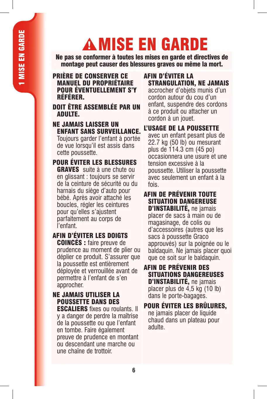 DOIT ÊTRE ASSEMBLÉE PAR UN enfant, suspendre des cordons à ce produit ou attacher un ADULTE. cordon à un jouet. NE JAMAIS LAISSER UN ENFANT SANS SURVEILLANCE. L’USAGE DE LA POUSSETTE Toujours garder l’enfant à portée avec un enfant pesant plus de 22.7 kg (50 lb) ou mesurant de vue lorsqu’il est assis dans plus de 114.3 cm (45 po) cette poussette. occasionnera une usure et une POUR ÉVITER LES BLESSURES tension excessive à la GRAVES suite à une chute ou poussette. Utiliser la poussette en glissant : toujours se servir avec seulement un enfant à la de la ceinture de sécurité ou du fois. harnais du siège d’auto pour AFIN DE PRÉVENIR TOUTE bébé. Après avoir attaché les SITUATION DANGEREUSE boucles, régler les ceintures D’INSTABILITÉ, ne jamais pour qu’elles s’ajustent placer de sacs à main ou de parfaitement au corps de magasinage, de colis ou l’enfant. d’accessoires (autres que les AFIN D’ÉVITER LES DOIGTS sacs à poussette Graco COINCÉS : faire preuve de approuvés) sur la poignée ou le prudence au moment de plier ou baldaquin. Ne jamais placer quoi déplier ce produit. S’assurer que que ce soit sur le baldaquin. la poussette est entièrement déployée et verrouillée avant de AFIN DE PRÉVENIR DES SITUATIONS DANGEREUSES permettre à l’enfant de s’en D’INSTABILITÉ, ne jamais approcher. placer plus de 4,5 kg (10 lb) NE JAMAIS UTILISER LA dans le porte-bagages. POUSSETTE DANS DES ESCALIERS fixes ou roulants. Il POUR ÉVITER LES BRÛLURES, y a danger de perdre la maîtrise ne jamais placer de liquide chaud dans un plateau pour de la poussette ou que l’enfant adulte. en tombe. Faire également preuve de prudence en montant ou descendant une marche ou une chaîne de trottoir. 6