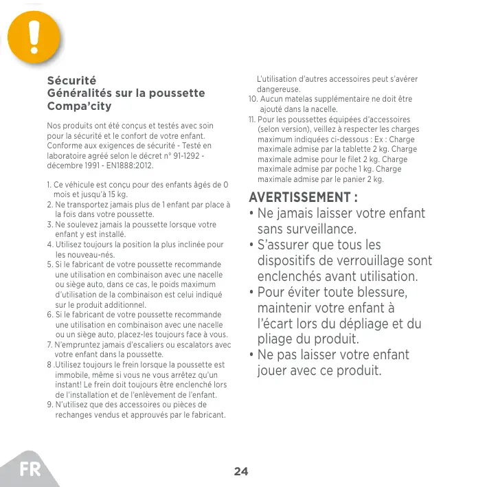 Sécurité Généralités sur la poussette Compa’city Nos produits ont été conçus et testés avec soin pour la sécurité et le confort de votre enfant. Conforme aux exigences de sécurité - Testé en laboratoire agréé selon le décret n° 91-1292 décembre 1991 - EN1888:2012.