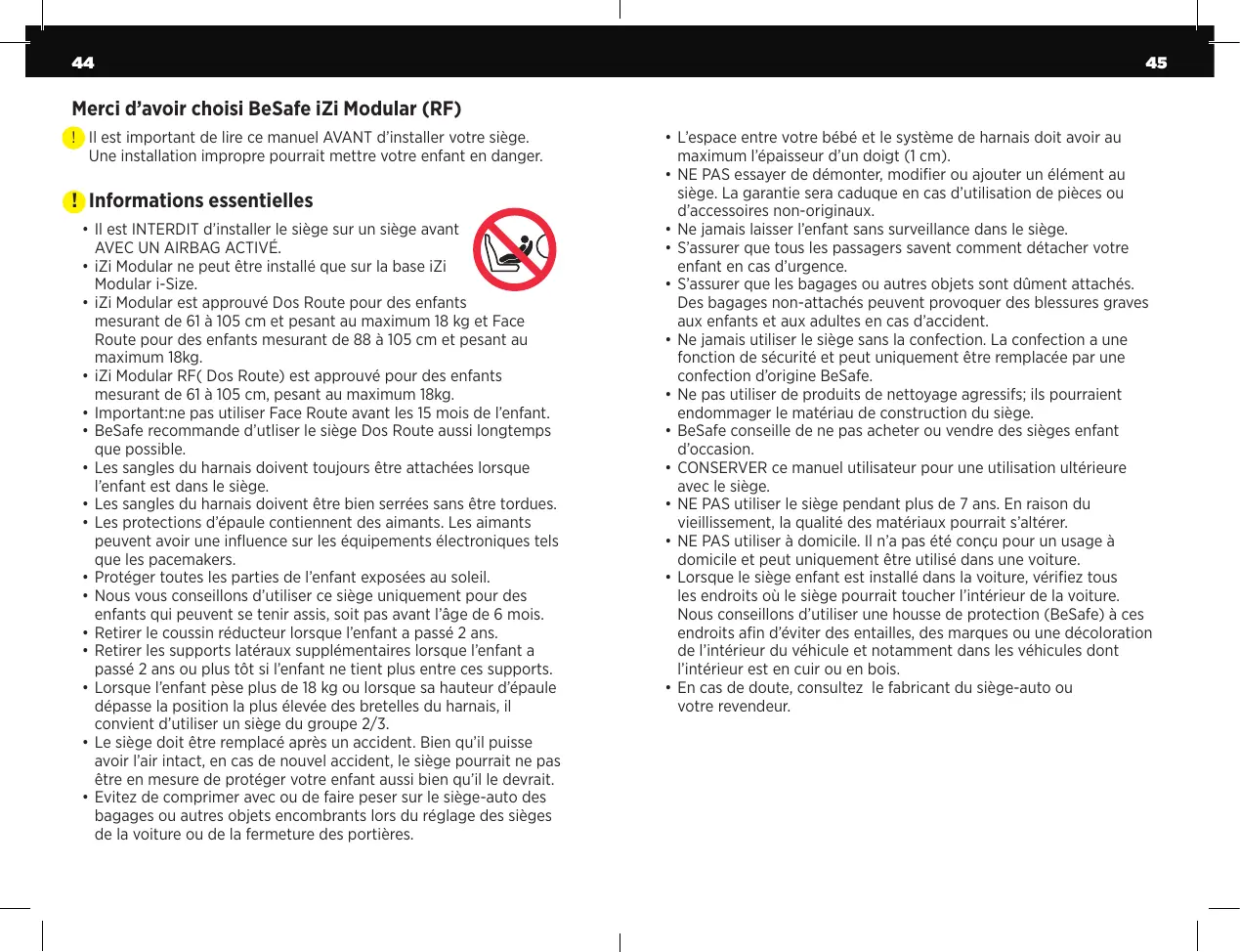 • Il est INTERDIT d’installer le siège sur un siège avant AVEC UN AIRBAG ACTIVÉ. • iZi Modular ne peut être installé que sur la base iZi Modular i-Size. • iZi Modular est approuvé Dos Route pour des enfants mesurant de 61 à 105 cm et pesant au maximum 18 kg et Face Route pour des enfants mesurant de 88 à 105 cm et pesant au maximum 18kg. • iZi Modular RF( Dos Route) est approuvé pour des enfants mesurant de 61 à 105 cm, pesant au maximum 18kg. • Important:ne pas utiliser Face Route avant les 15 mois de l’enfant. • BeSafe recommande d’utliser le siège Dos Route aussi longtemps que possible. • Les sangles du harnais doivent toujours être attachées lorsque l’enfant est dans le siège. • Les sangles du harnais doivent être bien serrées sans être tordues. • Les protections d’épaule contiennent des aimants. Les aimants peuvent avoir une influence sur les équipements électroniques tels que les pacemakers. • Protéger toutes les parties de l’enfant exposées au soleil. • Nous vous conseillons d’utiliser ce siège uniquement pour des enfants qui peuvent se tenir assis, soit pas avant l’âge de 6 mois. • Retirer le coussin réducteur lorsque l’enfant a passé 2 ans. • Retirer les supports latéraux supplémentaires lorsque l’enfant a passé 2 ans ou plus tôt si l’enfant ne tient plus entre ces supports. • Lorsque l’enfant pèse plus de 18 kg ou lorsque sa hauteur d’épaule dépasse la position la plus élevée des bretelles du harnais, il convient d’utiliser un siège du groupe 2/3. • Le siège doit être remplacé après un accident. Bien qu’il puisse avoir l’air intact, en cas de nouvel accident, le siège pourrait ne pas être en mesure de protéger votre enfant aussi bien qu’il le devrait. • Evitez de comprimer avec ou de faire peser sur le siège-auto des bagages ou autres objets encombrants lors du réglage des sièges de la voiture ou de la fermeture des portières.