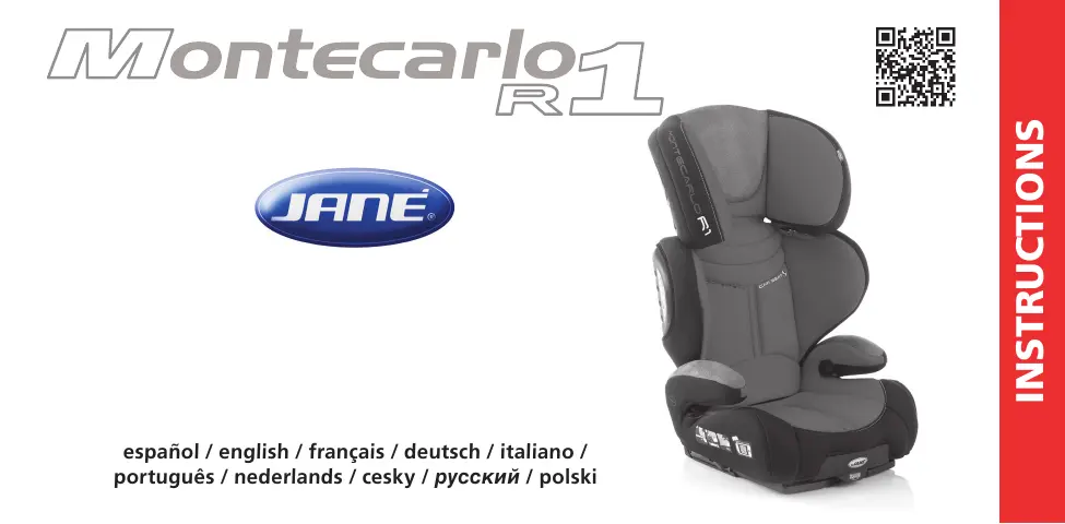 Tous les systèmes de sécurité ne sont pas exactement identiques, raison pour laquelle nous vous conseillons d’essayer le siège MONTECARLO R1 dans la voiture dans laquelle vous allez l’installer. Il est fondamental de ne pas utiliser d’articles d’occasion car JANE peut uniquement garantir la totale sécurité des articles utilisés par l’acheteur initial. Ne laissez pas les enfants jouer sans surveillance à proximité du siège auto. Ne l’utilisez pas si un élément est cassé ou déchiré. Utilisez uniquement des éléments JANÉ originaux. ATTENTION :Renseignez-vous sur le code de la route en vigueur dans le pays de circulation. L’utilisation de votre système de retenue des enfants peut être limitée.