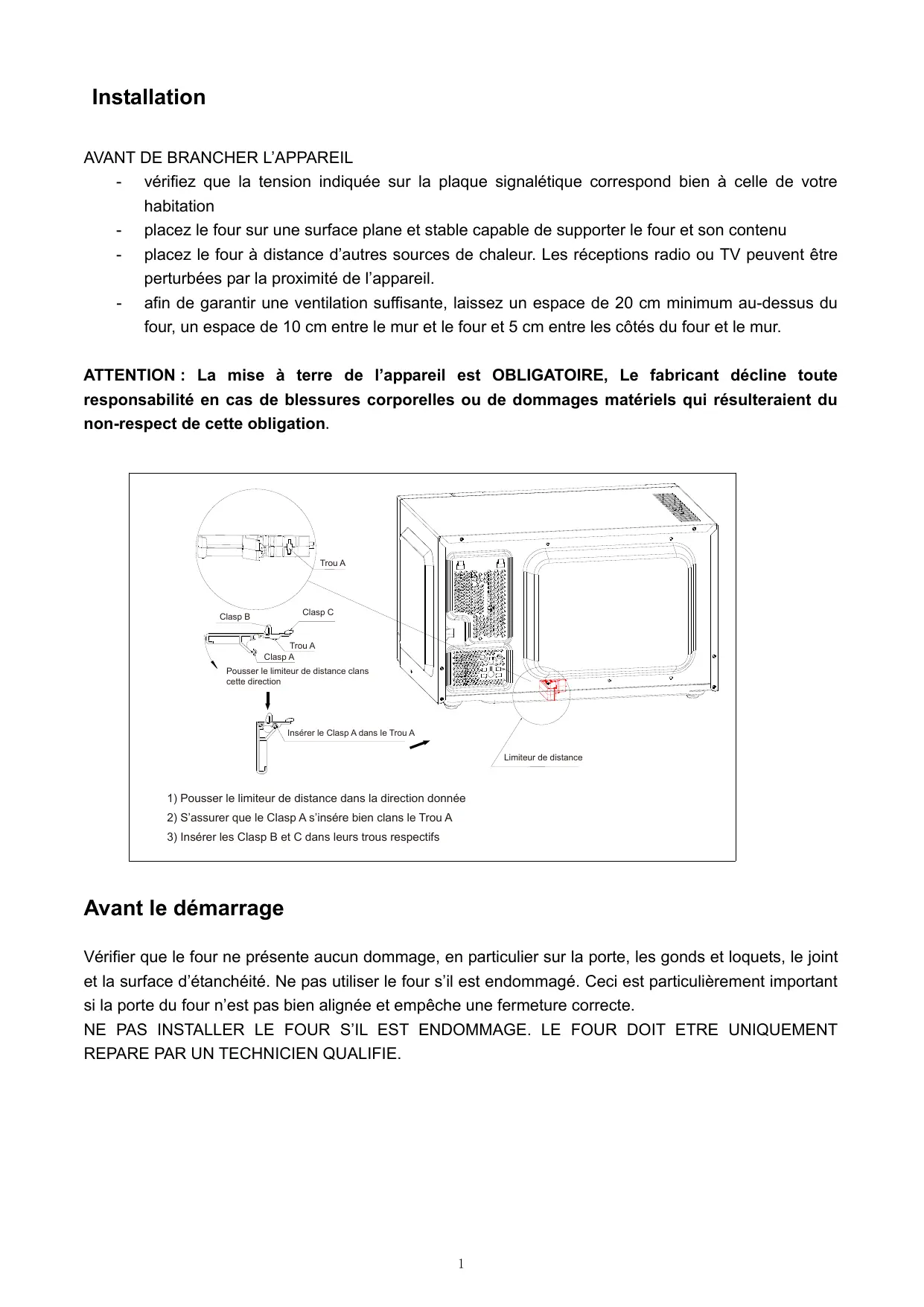 - vérifiez que la tension indiquée sur la plaque signalétique correspond bien à celle de votre habitation - placez le four sur une surface plane et stable capable de supporter le four et son contenu - placez le four à distance d’autres sources de chaleur. Les réceptions radio ou TV peuvent être perturbées par la proximité de l’appareil. - afin de garantir une ventilation suffisante, laissez un espace de 20 cm minimum au-dessus du four, un espace de 10 cm entre le mur et le four et 5 cm entre les côtés du four et le mur. ATTENTION : La mise à terre de l’appareil est OBLIGATOIRE, Le fabricant décline toute responsabilité en cas de blessures corporelles ou de dommages matériels qui résulteraient du non-respect de cette obligation. Trou A Clasp C Clasp B Trou A Clasp A Pousser le limiteur de distance clans cette direction Insérer le Clasp A dans le Trou A Limiteur de distance