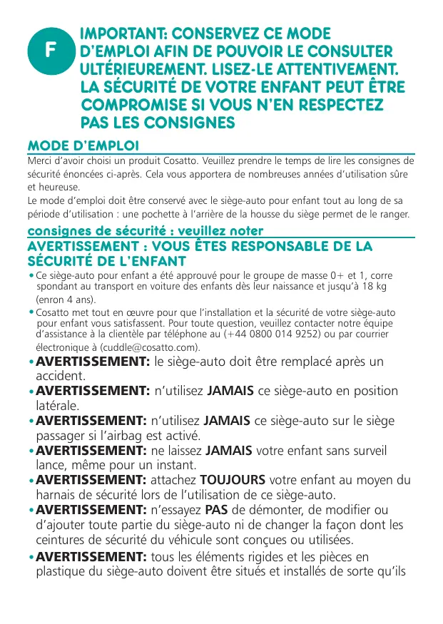 - Cosatto met tout en œuvre pour que l’installation et la sécurité de votre siège-auto pour enfant vous satisfassent. Pour toute question, veuillez contacter notre équipe d’assistance à la clientèle par téléphone au (+44 0800 014 9252) ou par courrier électronique à (cuddle@cosatto.com).