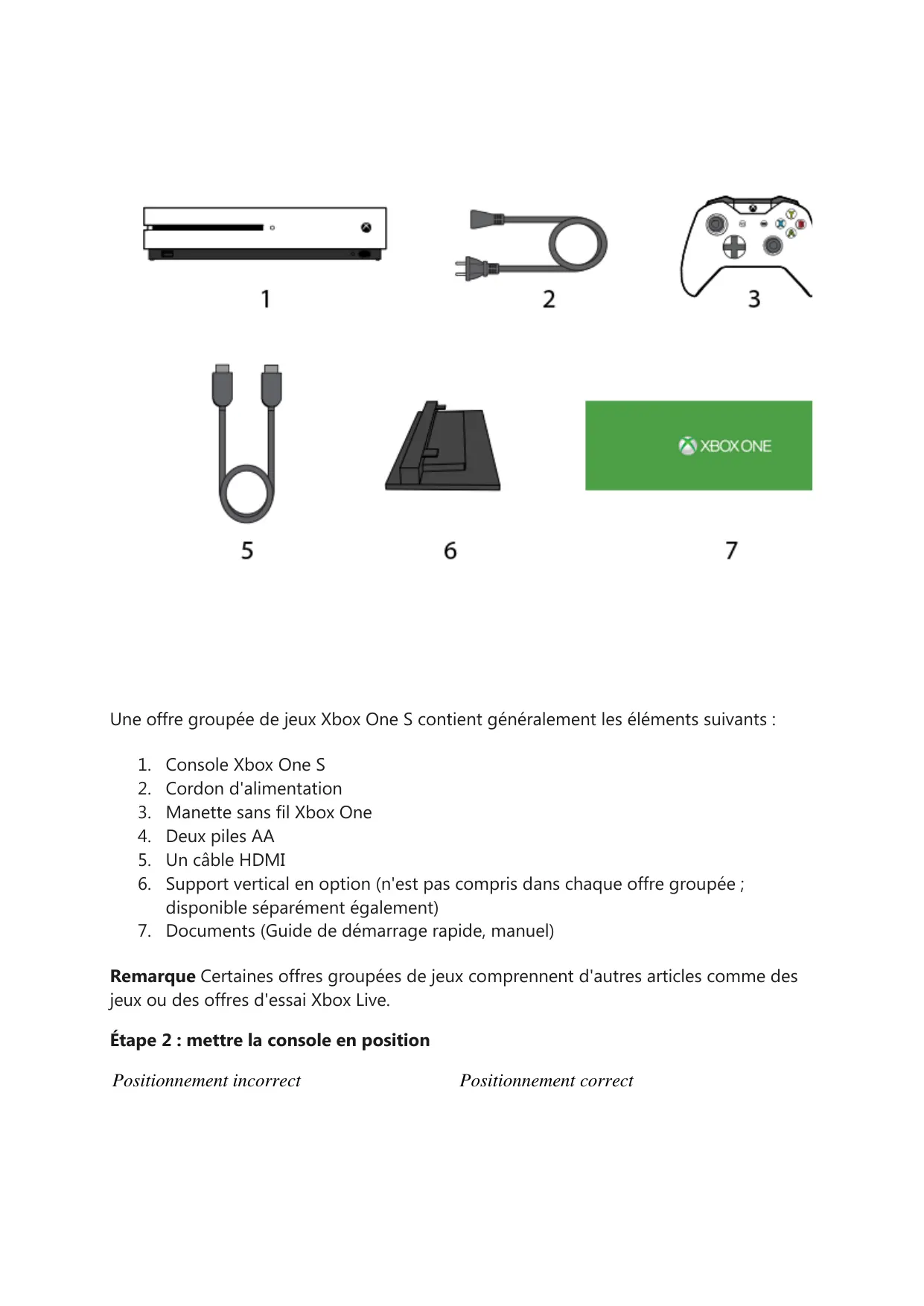 Console Xbox One S Cordon d'alimentation Manette sans fil Xbox One Deux piles AA Un câble HDMI Support vertical en option (n'est pas compris dans chaque offre groupée ; disponible séparément également) 7. Documents (Guide de démarrage rapide, manuel) Remarque Certaines offres groupées de jeux comprennent d'autres articles comme des jeux ou des offres d'essai Xbox Live. Étape 2 : mettre la console en position