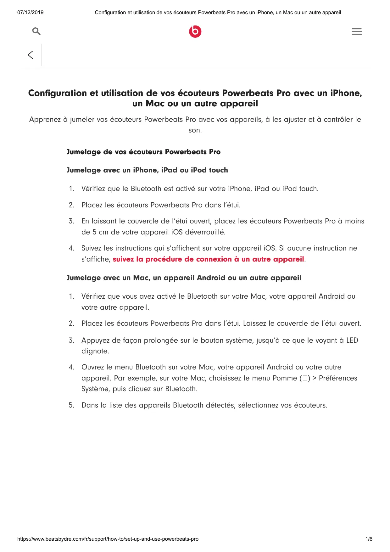 07/12/2019 Configuration et utilisation de vos écouteurs Powerbeats Pro avec un iPhone, un Mac ou un autre appareil Configuration et utilisation de vos écouteurs Powerbeats Pro avec un iPhone, un Mac ou un autre appareil Apprenez à jumeler vos écouteurs Powerbeats Pro avec vos appareils, à les ajuster et à contrôler le son. Jumelage de vos écouteurs Powerbeats Pro Jumelage avec un iPhone, iPad ou iPod touch