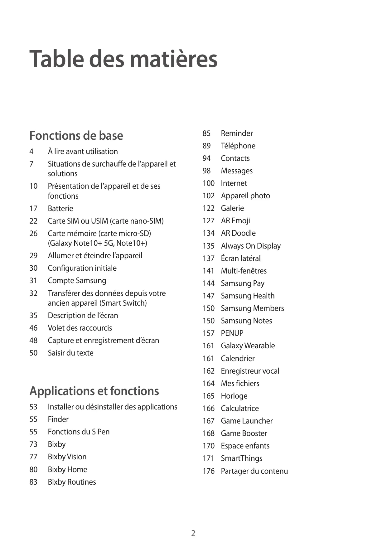À lire avant utilisation Situations de surchauffe de l’appareil et solutions Présentation de l’appareil et de ses fonctions Batterie Carte SIM ou USIM (carte nano-SIM) Carte mémoire (carte micro-SD) (Galaxy Note10+ 5G, Note10+) Allumer et éteindre l’appareil Configuration initiale Compte Samsung Transférer des données depuis votre ancien appareil (Smart Switch) Description de l’écran Volet des raccourcis Capture et enregistrement d’écran Saisir du texte Applications et fonctions