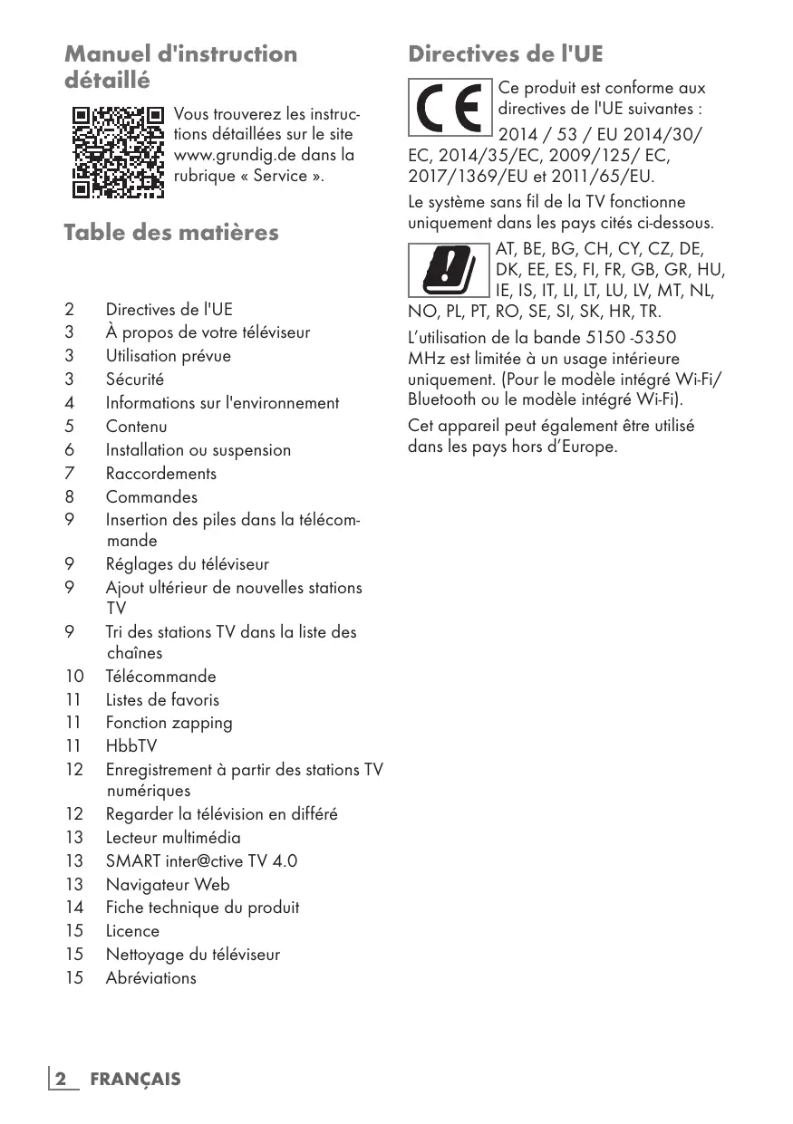 Directives de l'UE À propos de votre téléviseur Utilisation prévue Sécurité Informations sur l'environnement Contenu Installation ou suspension Raccordements Commandes Insertion des piles dans la télécommande Réglages du téléviseur Ajout ultérieur de nouvelles stations TV Tri des stations TV dans la liste des chaînes Télécommande Listes de favoris Fonction zapping HbbTV Enregistrement à partir des stations TV numériques Regarder la télévision en différé Lecteur multimédia SMART inter@ctive TV 4.0 Navigateur Web Fiche technique du produit Licence Nettoyage du téléviseur Abréviations