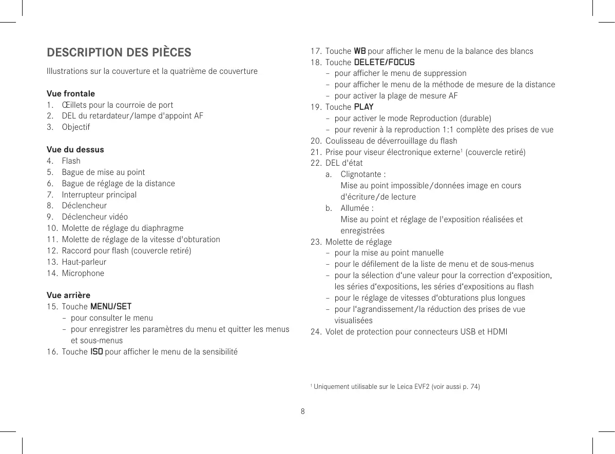 | Compatibilités | Objectifs Leica T, objectifs M avec adaptateur |
