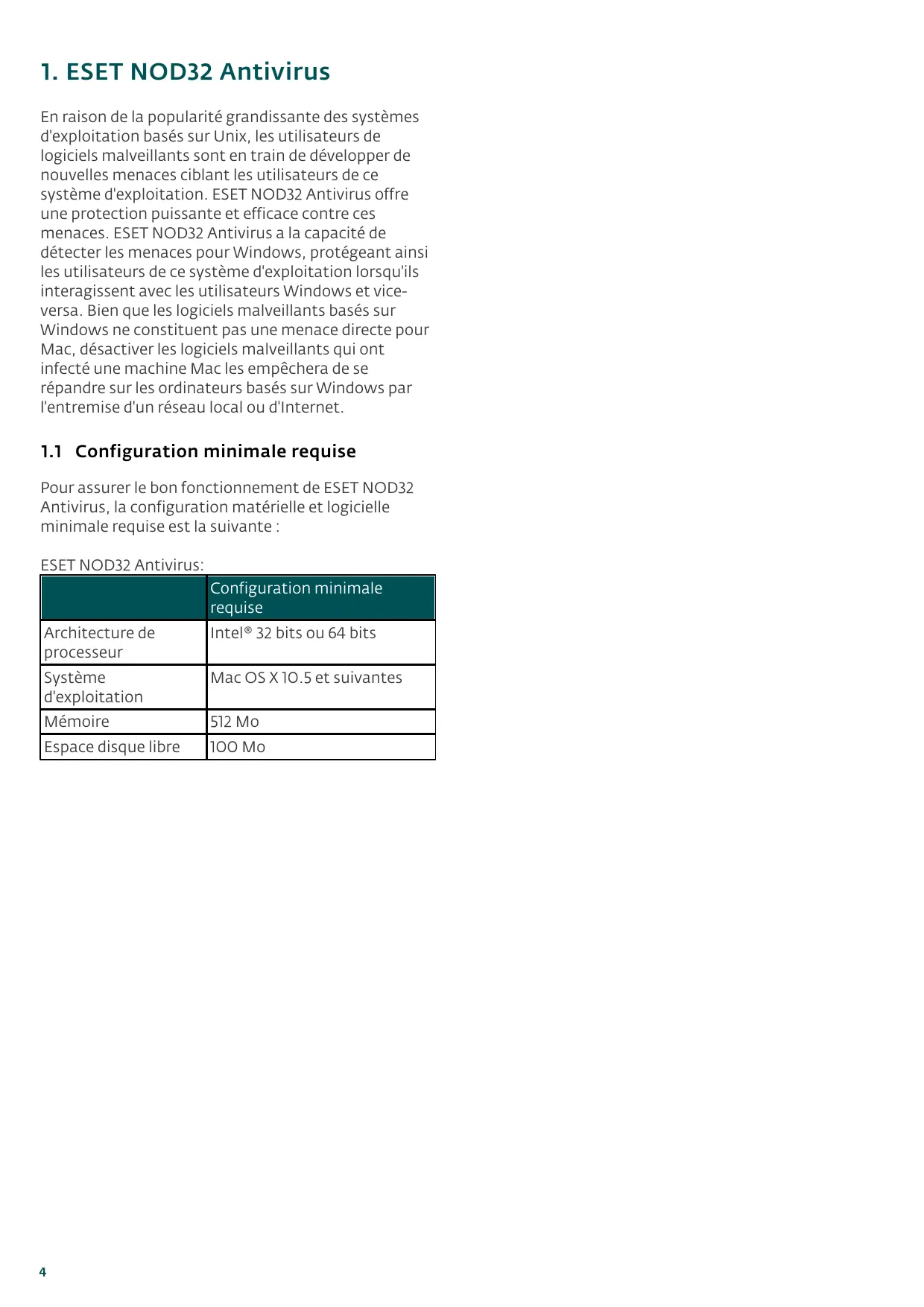 Pour assurer le bon fonctionnement de ESET NOD32 Antivirus, la configuration matérielle et logicielle minimale requise est la suivante : ESET NOD32 Antivirus: Configuration minimale requise Architecture de processeur Intel® 32 bits ou 64 bits Système d'exploitation Mac OS X 10.5 et suivantes Mémoire 512 Mo Espace disque libre 100 Mo