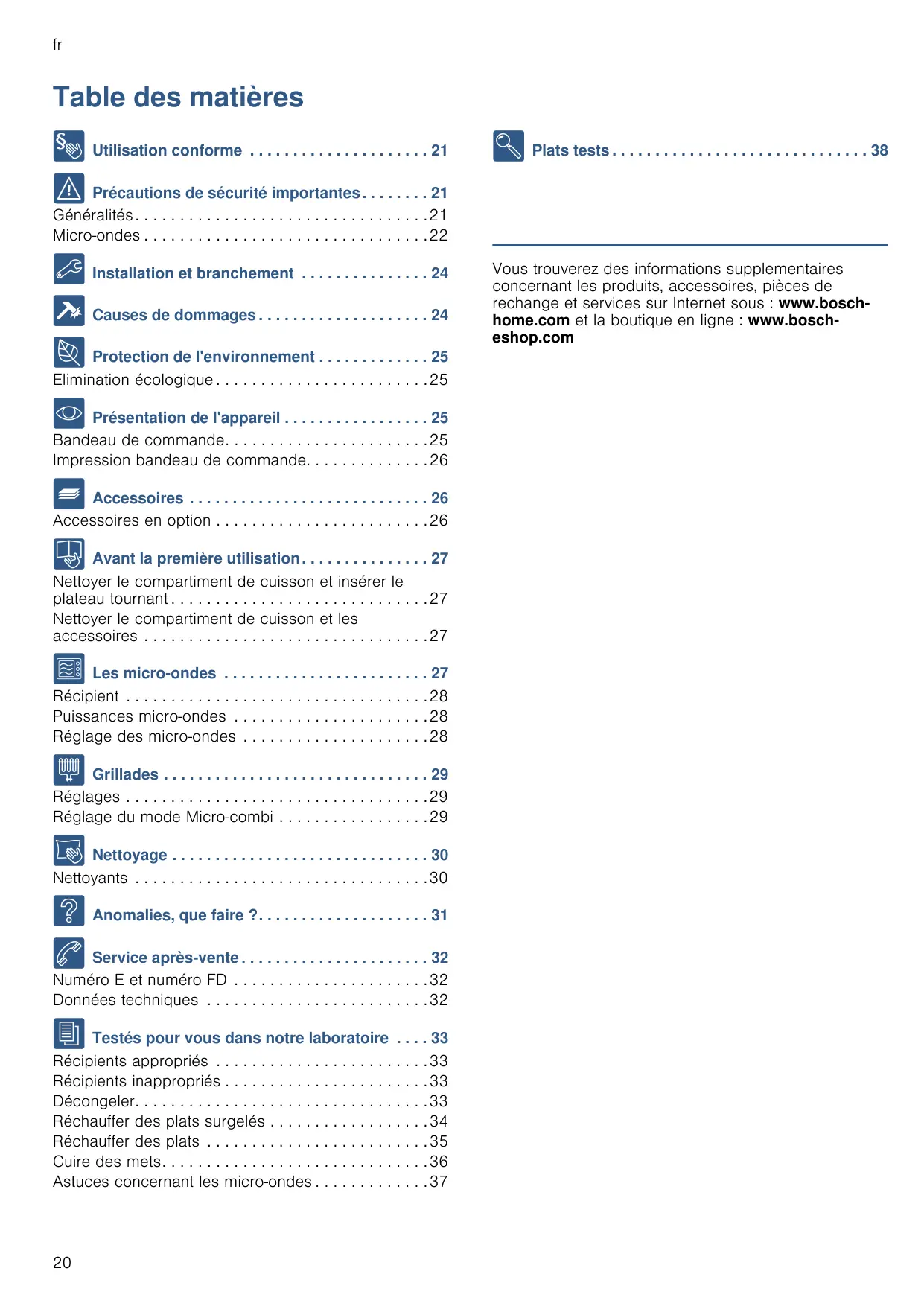 Vous trouverez des informations supplementaires concernant les produits, accessoires, pièces de rechange et services sur Internet sous : www.boschhome.com et la boutique en ligne : www.boscheshop.com