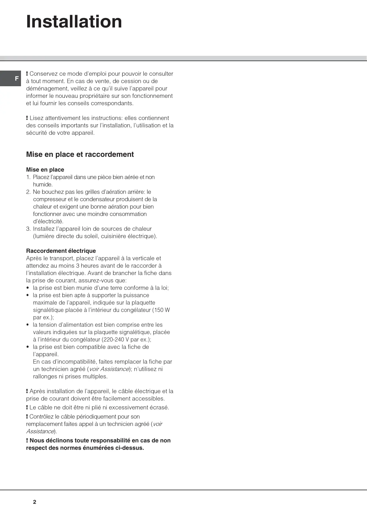 (lumière directe du soleil, cuisinière électrique). Raccordement électrique Après le transport, placez l’appareil à la verticale et attendez au moins 3 heures avant de le raccorder à l’installation électrique. Avant de brancher la fiche dans la prise de courant, assurez-vous que: • la prise est bien munie d’une terre conforme à la loi; • la prise est bien apte à supporter la puissance maximale de l’appareil, indiquée sur la plaquette signalétique placée à l’intérieur du congélateur (150 W par ex.); • la tension d’alimentation est bien comprise entre les valeurs indiquées sur la plaquette signalétique, placée à l’intérieur du congélateur (220-240 V par ex.); • la prise est bien compatible avec la fiche de l’appareil. En cas d’incompatibilité, faites remplacer la fiche par un technicien agréé (voir Assistance); n’utilisez ni rallonges ni prises multiples. ! Après installation de l’appareil, le câble électrique et la prise de courant doivent être facilement accessibles. ! Le câble ne doit être ni plié ni excessivement écrasé. ! Contrôlez le câble périodiquement pour son remplacement faites appel à un technicien agréé (voir Assistance). ! Nous déclinons toute responsabilité en cas de non respect des normes énumérées ci-dessus.