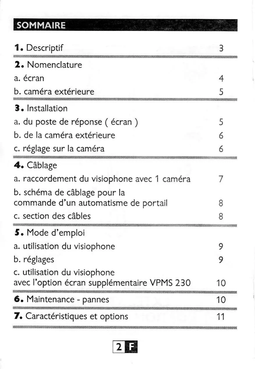 Ce visiophone est composé d'un poste de réponse interieur avec écran et d'une platine extérieure avec interphone etamera permettant de voir et communiquer avec le visiteur qui a sonné. Il est facile d'installation puisque seulement 2 fils sont nécessaires pour toutes les fonctions : sonnerie, image video, interphone et commande de l'ouvre-porte. Pour un usage efficace, veuillez dire attentivement ce manuel d'instructions.