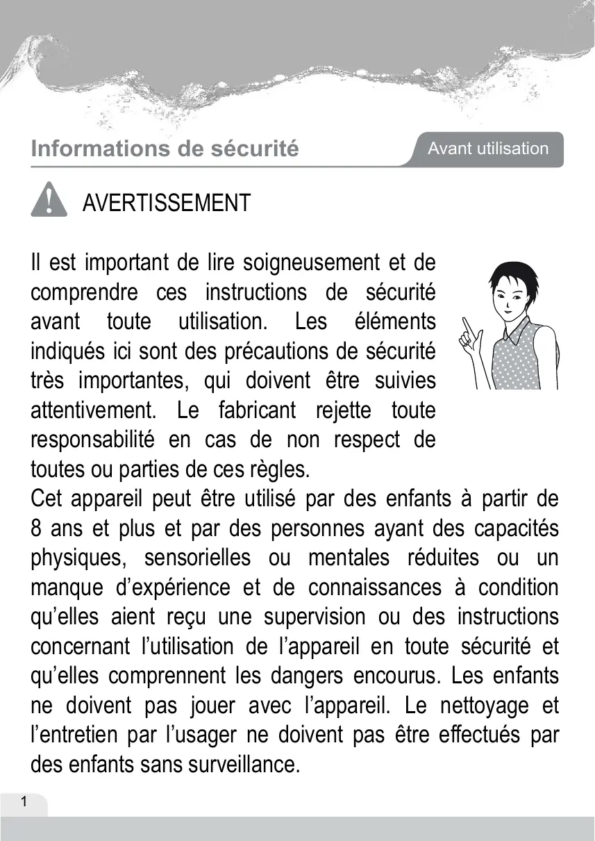 - Cet appareil n’est pas destiné à être utilisé par des jeunes enfants ou par des personnes infirmes sans supervision.