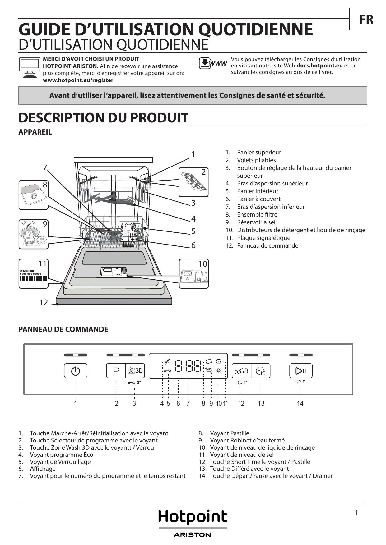 HOTPOINT ARISTON. Afin de recevoir une assistance plus complète, merci d’enregistrer votre appareil sur on: www.hotpoint.eu/register Vous pouvez télécharger les Consignes d’utilisation en visitant notre site Web docs.hotpoint.eu et en suivant les consignes au dos de ce livret. Avant d’utiliser l’appareil, lisez attentivement les Consignes de santé et sécurité.