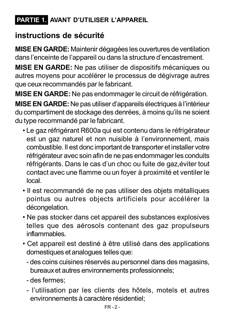 instructions de sécurité MISE EN GARDE: Maintenir dégagées les ouvertures de ventilation dans l’enceinte de l’appareil ou dans la structure d’encastrement. MISE EN GARDE: Ne pas utiliser de dispositifs mécaniques ou autres moyens pour accélérer le processus de dégivrage autres que ceux recommandés par le fabricant. MISE EN GARDE: Ne pas endommager le circuit de réfrigération. MISE EN GARDE: Ne pas utiliser d’appareils électriques à l’intérieur du compartiment de stockage des denrées, à moins qu’ils ne soient du type recommandé par le fabricant.