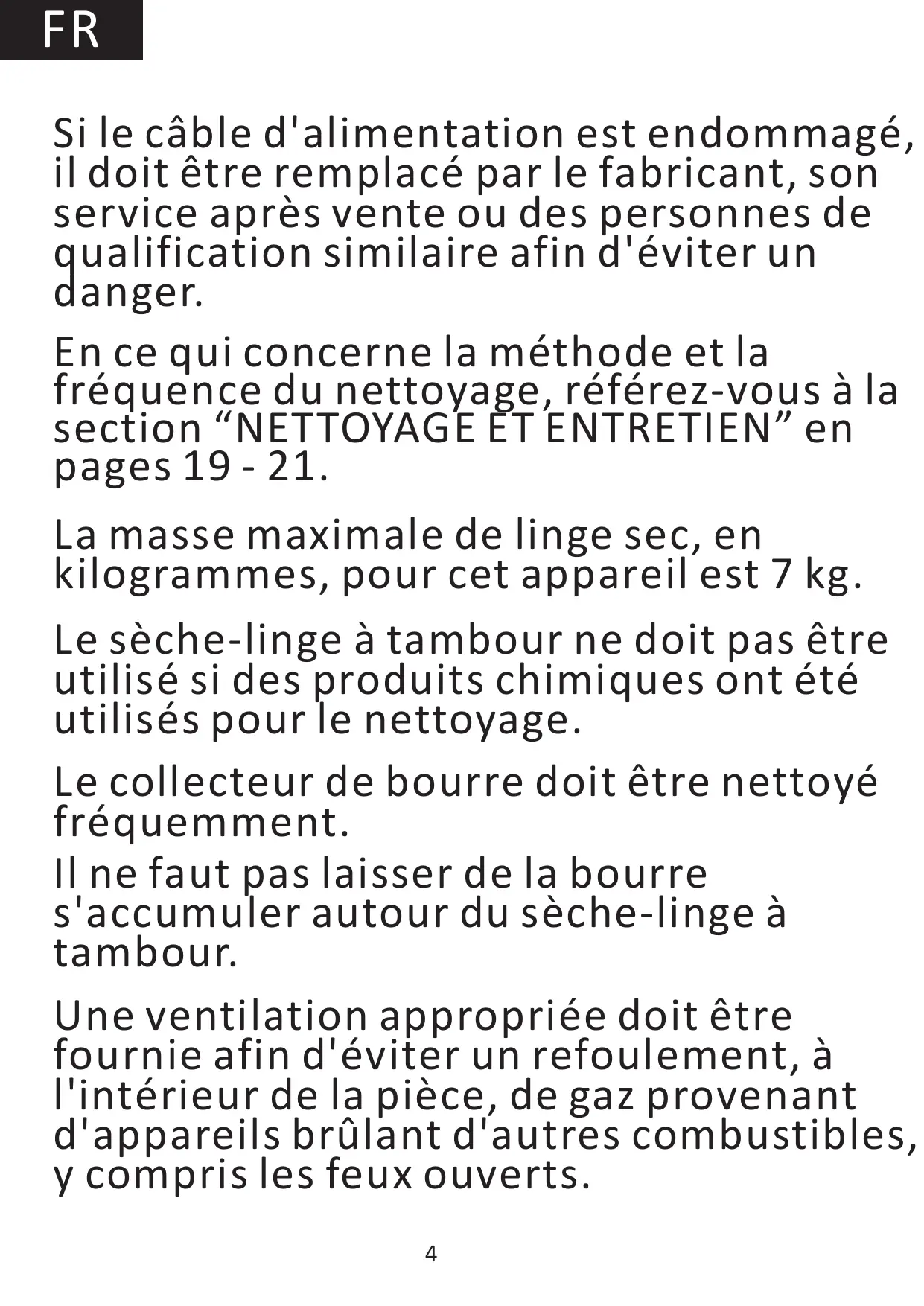 FR Si le câble d'alimentation est endommagé, il doit être remplacé par le fabricant, son service après vente ou des personnes de qualification similaire afin d'éviter un danger. En ce qui concerne la méthode et la fréquence du nettoyage, référez-vous à la section “NETTOYAGE ET ENTRETIEN” en pages 19 - 21. La masse maximale de linge sec, en kilogrammes, pour cet appareil est 7 kg. Le sèche-linge à tambour ne doit pas être utilisé si des produits chimiques ont été utilisés pour le nettoyage. Le collecteur de bourre doit être nettoyé fréquemment. Il ne faut pas laisser de la bourre s'accumuler autour du sèche-linge à tambour. Une ventilation appropriée doit être fournie afin d'éviter un refoulement, à l'intérieur de la pièce, de gaz provenant d'appareils brûlant d'autres combustibles, y compris les feux ouverts. 4