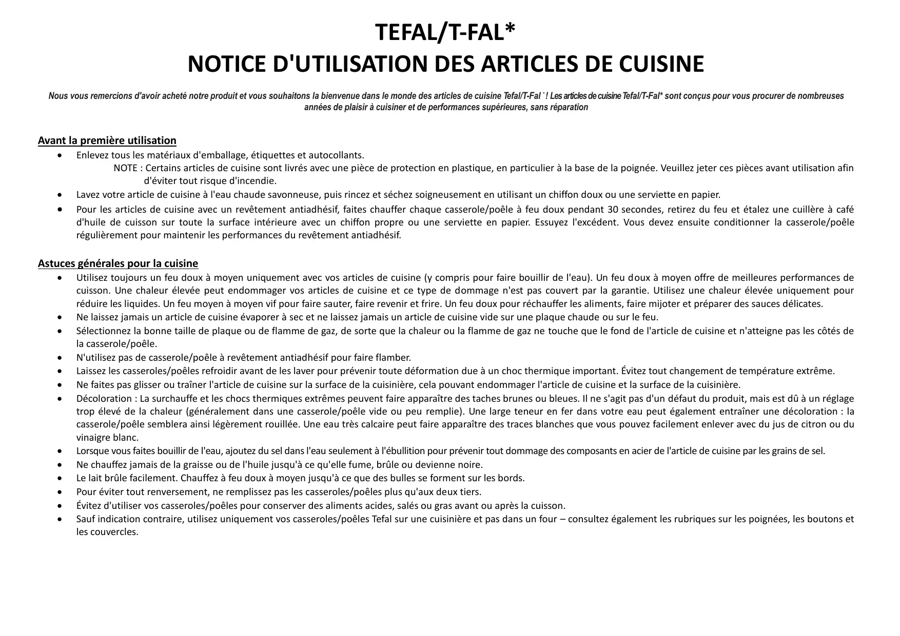 Nous vous remercions d'avoir acheté notre produit et vous souhaitons la bienvenue dans le monde des articles de cuisine Tefal/T-Fal * ! Les articles de cuisine Tefal/T-Fal* sont conçus pour vous procurer de nombreuses années de plaisir à cuisiner et de performances supérieures, sans réparation Avant la première utilisation