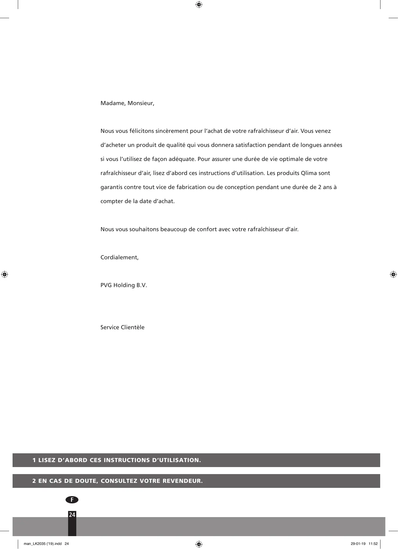 Nous vous félicitons sincèrement pour l’achat de votre rafraîchisseur d’air. Vous venez d’acheter un produit de qualité qui vous donnera satisfaction pendant de longues années si vous l’utilisez de façon adéquate. Pour assurer une durée de vie optimale de votre rafraîchisseur d’air, lisez d’abord ces instructions d’utilisation. Les produits Qlima sont garantis contre tout vice de fabrication ou de conception pendant une durée de 2 ans à compter de la date d’achat.