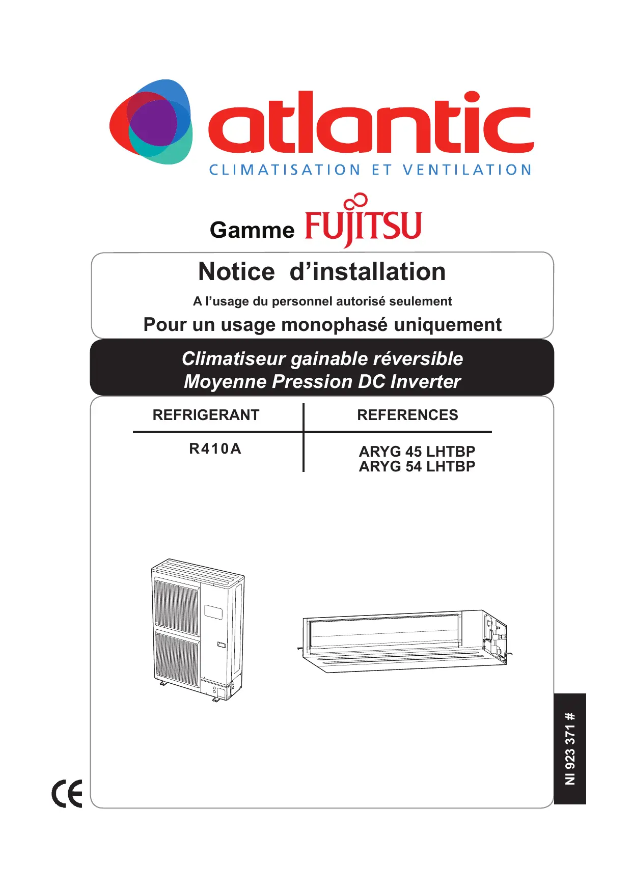 Gamme Notice d’installation A l’usage du personnel autorisé seulement Pour un usage monophasé uniquement Climatiseur gainable réversible Moyenne Pression DC Inverter R410A REFERENCES ARYG 45 LHTBP ARYG 54 LHTBP NI 923 371 # REFRIGERANT Découpez soigneusement votre notice simplifiée de télécommande, puis pliez la en 2 comme indiqué ci-dessous.