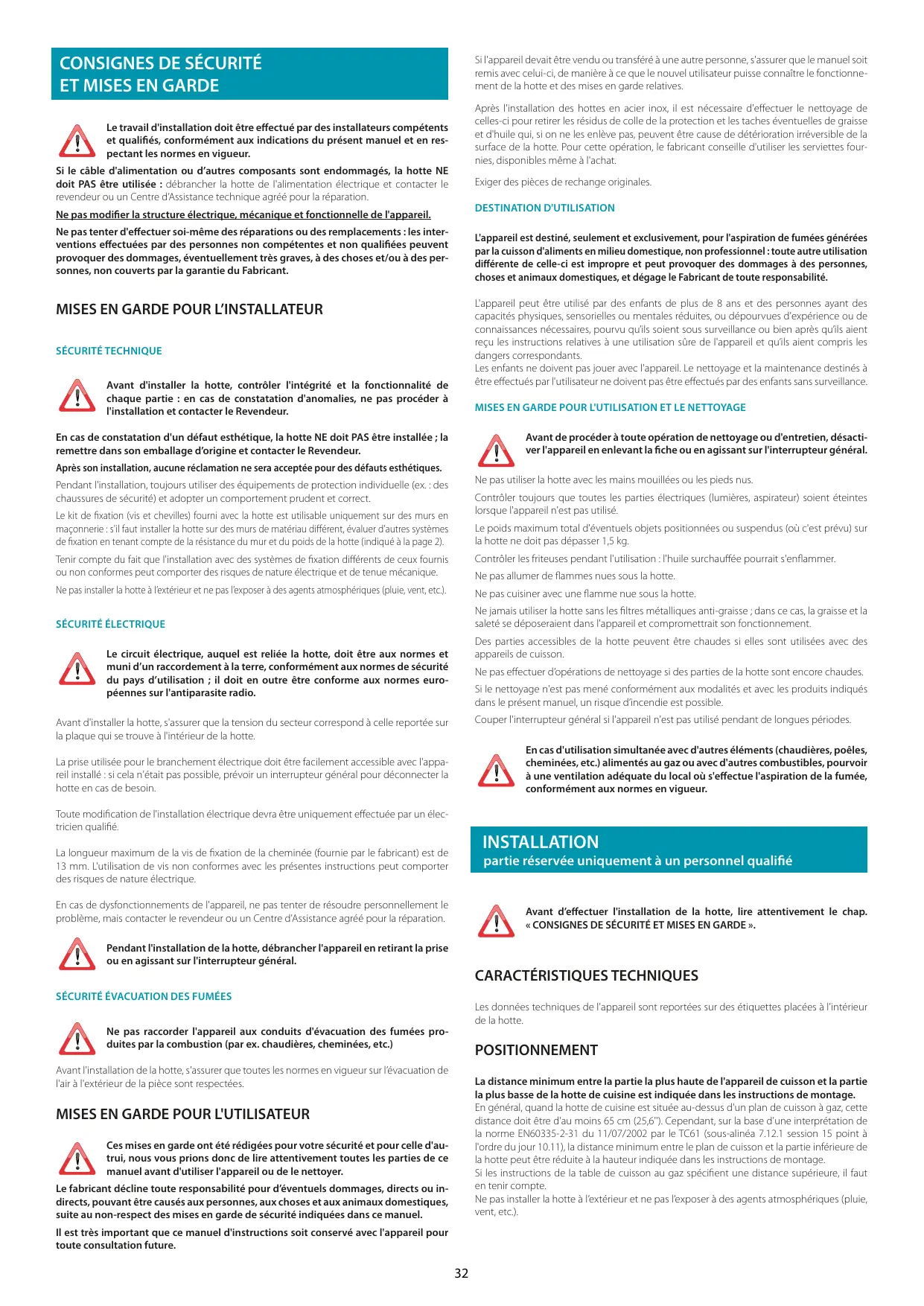 Si l'appareil devait être vendu ou transféré à une autre personne, s'assurer que le manuel soit remis avec celui-ci, de manière à ce que le nouvel utilisateur puisse connaître le fonctionnement de la hotte et des mises en garde relatives. Après l'installation des hottes en acier inox, il est nécessaire d'effectuer le nettoyage de celles-ci pour retirer les résidus de colle de la protection et les taches éventuelles de graisse et d'huile qui, si on ne les enlève pas, peuvent être cause de détérioration irréversible de la surface de la hotte. Pour cette opération, le fabricant conseille d'utiliser les serviettes fournies, disponibles même à l'achat. Le travail d'installation doit être effectué par des installateurs compétents et qualifiés, conformément aux indications du présent manuel et en respectant les normes en vigueur. Si le câble d'alimentation ou d’autres composants sont endommagés, la hotte NE doit PAS être utilisée : débrancher la hotte de l'alimentation électrique et contacter le revendeur ou un Centre d’Assistance technique agréé pour la réparation. Exiger des pièces de rechange originales. DESTINATION D'UTILISATION Ne pas modifier la structure électrique, mécanique et fonctionnelle de l'appareil. Ne pas tenter d'effectuer soi-même des réparations ou des remplacements : les interventions effectuées par des personnes non compétentes et non qualifiées peuvent provoquer des dommages, éventuellement très graves, à des choses et/ou à des personnes, non couverts par la garantie du Fabricant. L'appareil est destiné, seulement et exclusivement, pour l'aspiration de fumées générées par la cuisson d'aliments en milieu domestique, non professionnel : toute autre utilisation différente de celle-ci est impropre et peut provoquer des dommages à des personnes, choses et animaux domestiques, et dégage le Fabricant de toute responsabilité. L'appareil peut être utilisé par des enfants de plus de 8 ans et des personnes ayant des capacités physiques, sensorielles ou mentales réduites, ou dépourvues d'expérience ou de connaissances nécessaires, pourvu qu’ils soient sous surveillance ou bien après qu’ils aient reçu les instructions relatives à une utilisation sûre de l'appareil et qu’ils aient compris les dangers correspondants. Les enfants ne doivent pas jouer avec l'appareil. Le nettoyage et la maintenance destinés à être effectués par l'utilisateur ne doivent pas être effectués par des enfants sans surveillance.