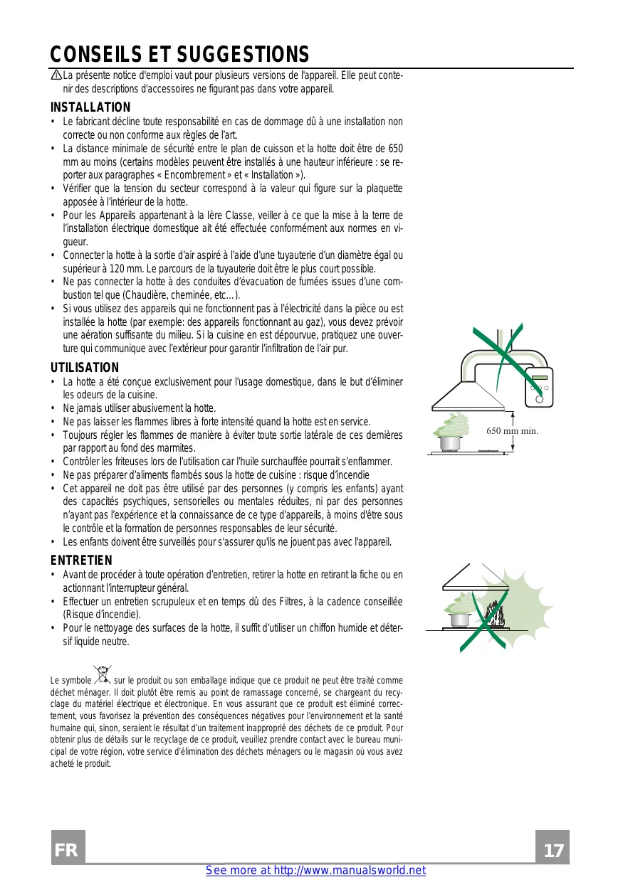 INSTALLATION • Le fabricant décline toute responsabilité en cas de dommage dû à une installation non correcte ou non conforme aux règles de l’art. • La distance minimale de sécurité entre le plan de cuisson et la hotte doit être de 650 mm au moins (certains modèles peuvent être installés à une hauteur inférieure : se reporter aux paragraphes « Encombrement » et « Installation »). • Vérifier que la tension du secteur correspond à la valeur qui figure sur la plaquette apposée à l’intérieur de la hotte. • Pour les Appareils appartenant à la Ière Classe, veiller à ce que la mise à la terre de l’installation électrique domestique ait été effectuée conformément aux normes en vigueur. • Connecter la hotte à la sortie d’air aspiré à l’aide d’une tuyauterie d’un diamètre égal ou supérieur à 120 mm. Le parcours de la tuyauterie doit être le plus court possible. • Ne pas connecter la hotte à des conduites d’évacuation de fumées issues d’une combustion tel que (Chaudière, cheminée, etc…). • Si vous utilisez des appareils qui ne fonctionnent pas à l’électricité dans la pièce ou est installée la hotte (par exemple: des appareils fonctionnant au gaz), vous devez prévoir une aération suffisante du milieu. Si la cuisine en est dépourvue, pratiquez une ouverture qui communique avec l’extérieur pour garantir l’infiltration de l’air pur.