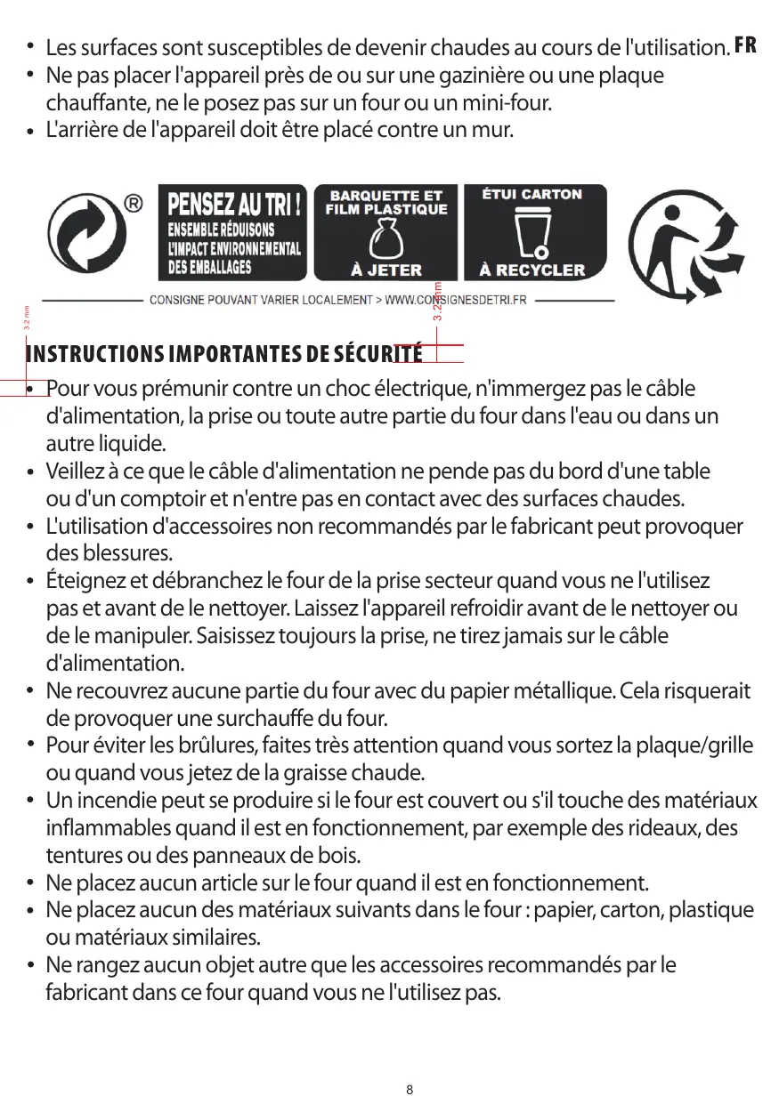 Pour vous prémunir contre un choc électrique, n'immergez pas le câble d'alimentation, la prise ou toute autre partie du four dans l'eau ou dans un autre liquide. Veillez à ce que le câble d'alimentation ne pende pas du bord d'une table ou d'un comptoir et n'entre pas en contact avec des surfaces chaudes. L'utilisation d'accessoires non recommandés par le fabricant peut provoquer des blessures. Éteignez et débranchez le four de la prise secteur quand vous ne l'utilisez pas et avant de le nettoyer. Laissez l'appareil refroidir avant de le nettoyer ou de le manipuler. Saisissez toujours la prise, ne tirez jamais sur le câble d'alimentation. Ne recouvrez aucune partie du four avec du papier métallique. Cela risquerait de provoquer une surchauffe du four. Pour éviter les brûlures, faites très attention quand vous sortez la plaque/grille ou quand vous jetez de la graisse chaude. Un incendie peut se produire si le four est couvert ou s'il touche des matériaux inflammables quand il est en fonctionnement, par exemple des rideaux, des tentures ou des panneaux de bois. Ne placez aucun article sur le four quand il est en fonctionnement. Ne placez aucun des matériaux suivants dans le four : papier, carton, plastique ou matériaux similaires. Ne rangez aucun objet autre que les accessoires recommandés par le fabricant dans ce four quand vous ne l'utilisez pas.