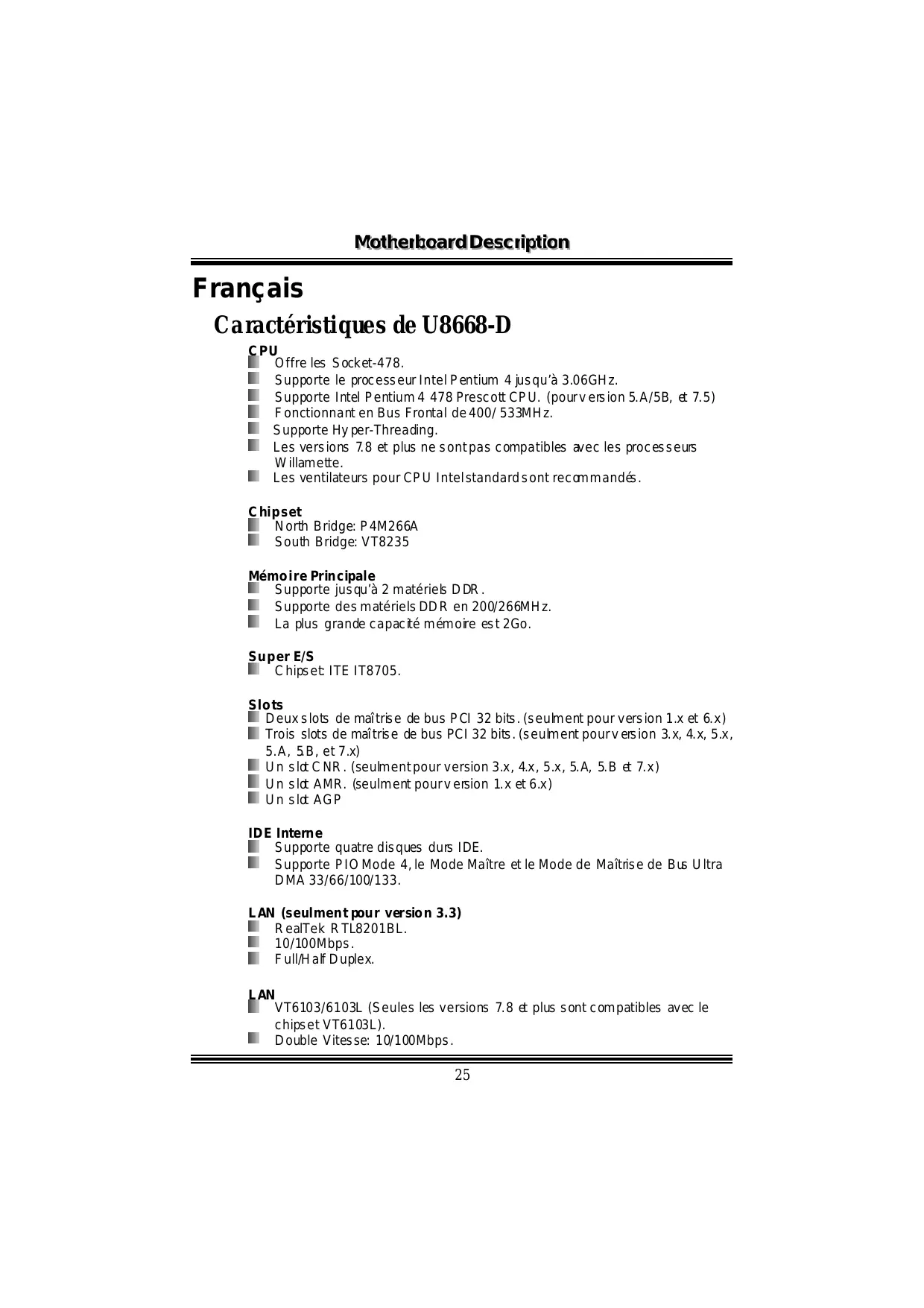 Facteur de Forme Micro ATX: 19.5cm X24.4cm (IX L) (seuilment pour version 3.x, 4x, 5.x, 5.A, 5.B et 7.x)